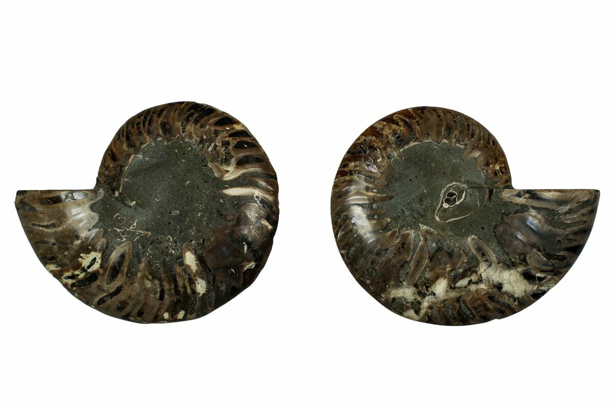 his is a beautiful 3.8" wide, cut and polished Cleoniceras ammonite from Ambatolafia, Madagascar, dating to the Albian Stage of the Late Cretaceous (~110 million years old). Its chambers reveal striking mineralization bordered by white calcite septa, creating an elegant, highly polished display piece. Both halves are included, along with display stands.