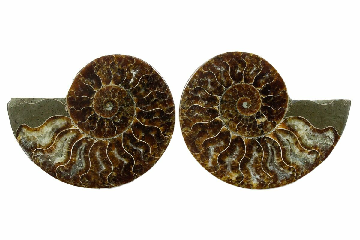 It exhibits gorgeous mineralization within the chambers, each separated by white calcite septa (divisions). This highly polished exotic ammonite makes a superb display piece with tremendous historical appeal.