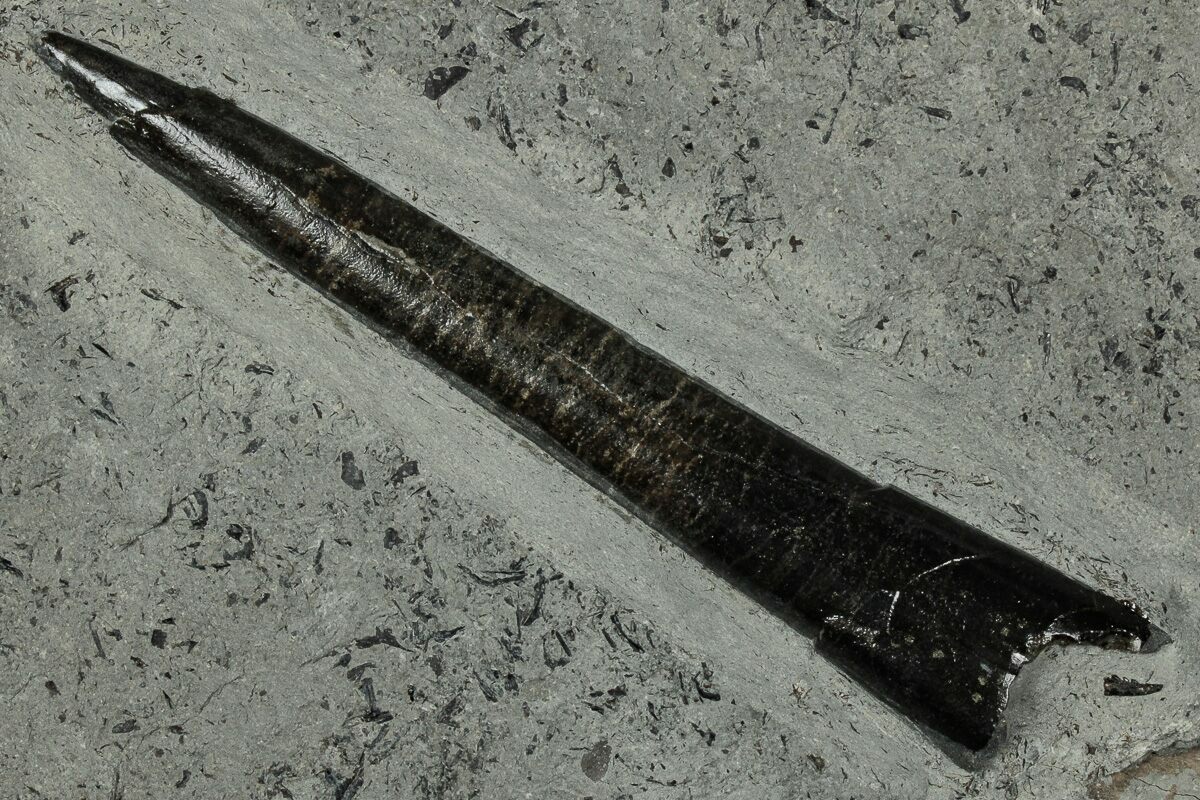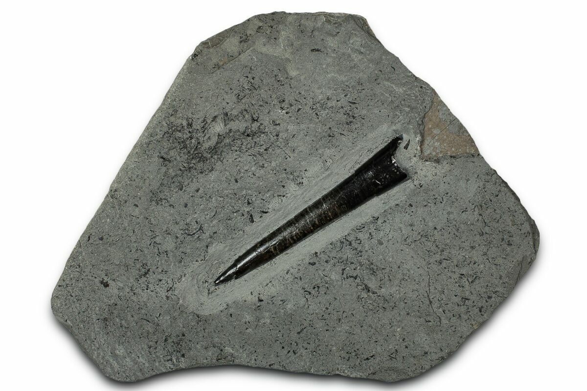 This is a 3.8" long fossil belemnite (Acrocoelites sp.) rostrum from the Jurassic-aged Posidonia Shale of Holzmaden, Germany. The belemnite fossil has been exposed from the rock it was found in.