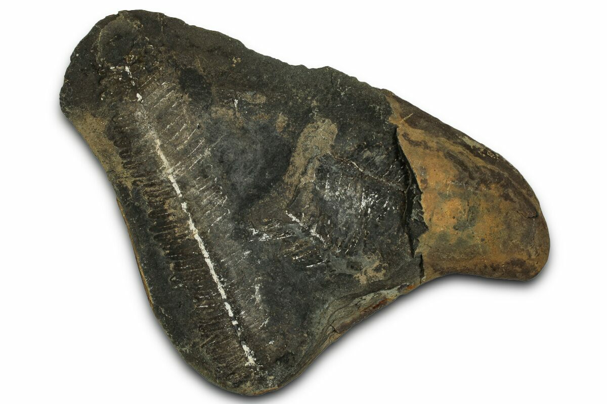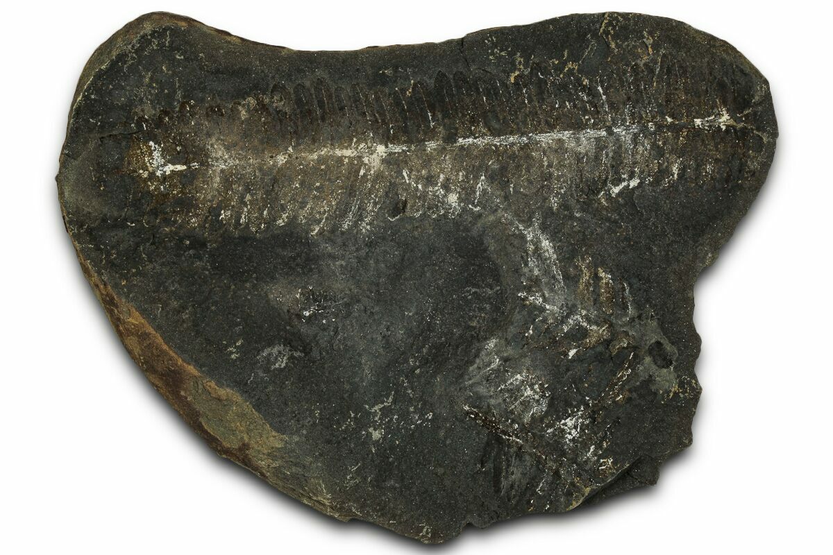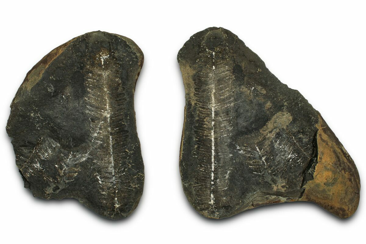 This is a 3.8" fern fossil (Pecopteris sp.) from the Carbondale Formation (Francis Creek Shale) in Braidwood, Illinois. It is preserved inside an ironstone nodule associated with the famous Mazon Creek Lagerstätte. Under magnification the detail of this specimen stands out. Both the positive (convex) and negative (concave) sides of the fossil nodule are included.
