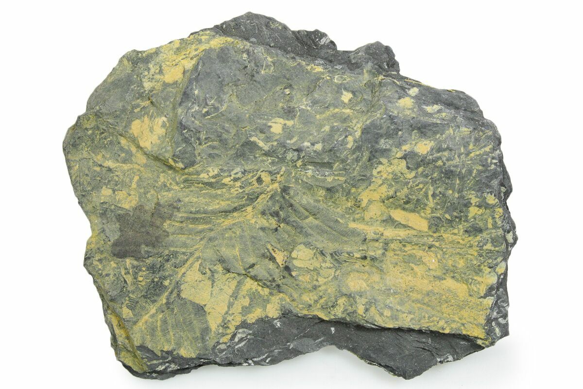 These plants were buried in a swamp where a low temperature, low pressure, and low oxygen environment caused the plant tissue to be slowly replaced by pyrite. This pyrite was later replaced by a whitish mineral (aluminum silicate) as the fossils were buried and exposed to the heat and pressure inside of the earth. The majority of the ferns on this plate are of the genus Alethopteris, though Pecopteris ferns can be seen from time to time.