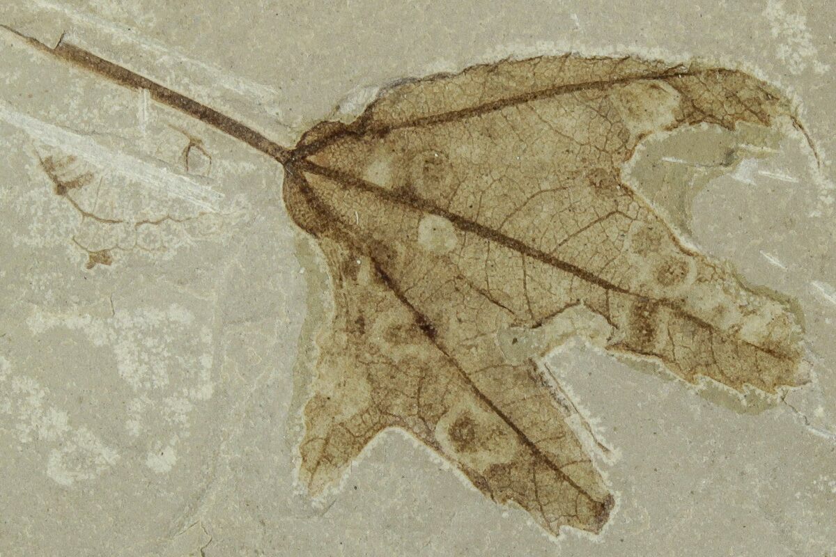 This is a fossil flora plate from the Green River Formation of Utah. It features a small but beautiful, 1.1" long (including stem) sycamore (Macginitiea wyomingensis) and a spleenwort (Asplenium delicatula) fossil. A third, partial leaf can be seen running off one edge of the rock.