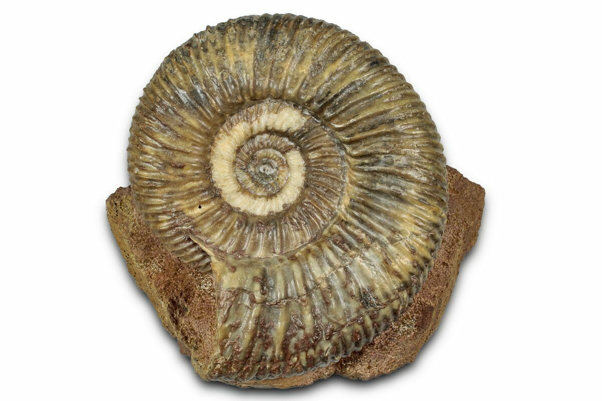 This is a beautiful, 3.8" wide ammonite (Parkinsonia sp.) fossil from the Parkinsonien-Oolith within the Berching Subformation (Sengenthal Formation) of Germany. This Jurassic-aged ammonite has been carefully exposed from the rock it was found in. The base of the rock has been cut flat for presentation.