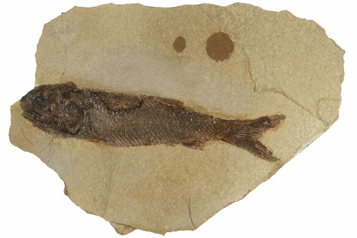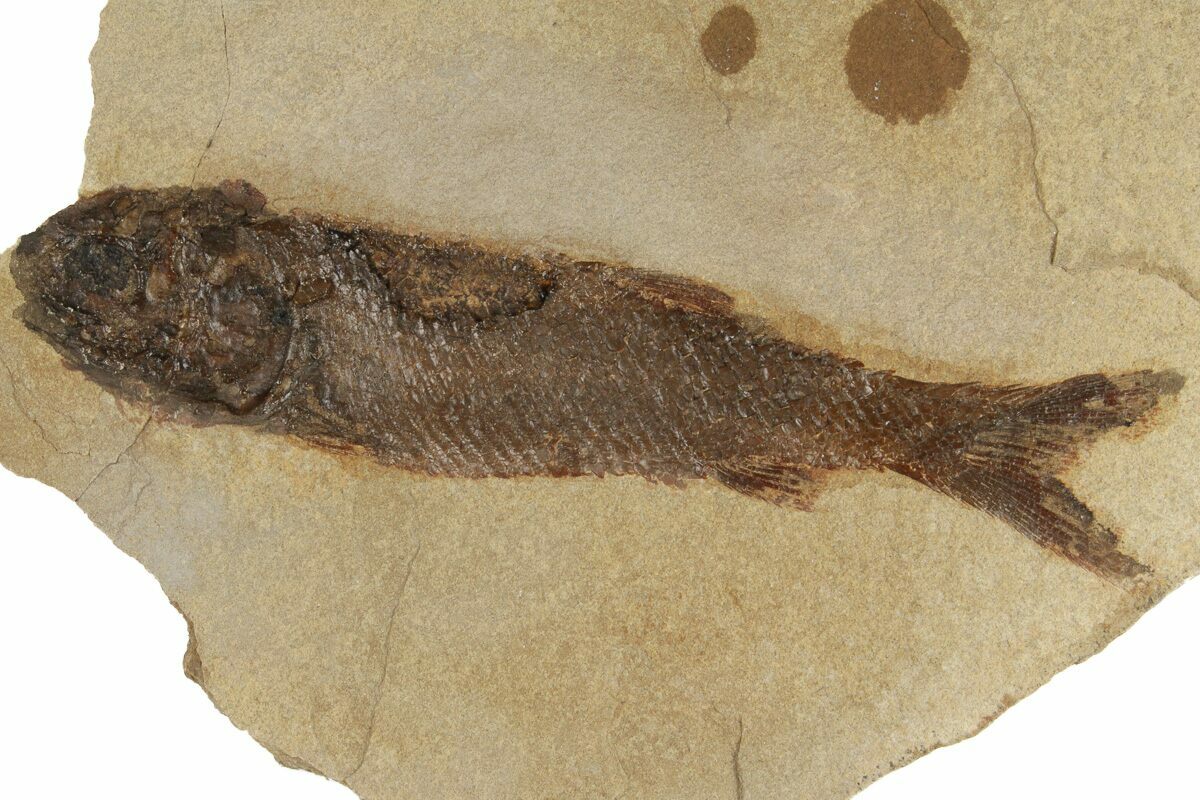 This is a 3.8" fossil fish from the Upper Jurassic aged, Sundance Formation (which underlies the Morrison Formation) in Cowley, Wyoming. This specimen belongs to the species Hulettia americana. It is the only member within this genus. These small forage fish prospered in waters that are now located in the Morrison Formation of Wyoming and the Sundance Formation of South Dakota. There is a couple repaired cracks on this specimen.
