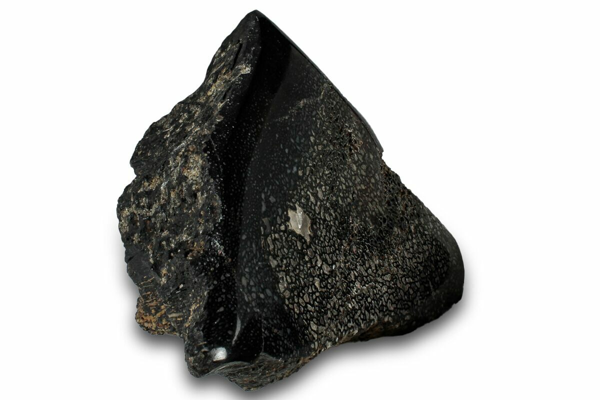 This is a 3.8" wide fossil dinosaur bone section, collected from the Late Jurassic-aged Morrison Formation at the famous Bone Cabin Quarry in Wyoming. The bone is very dense from silicification (gembone). One edge of the bone has been polished to a glossy finish to show off this silicification.