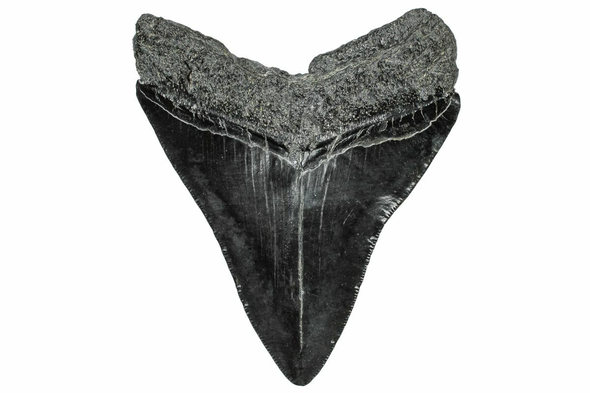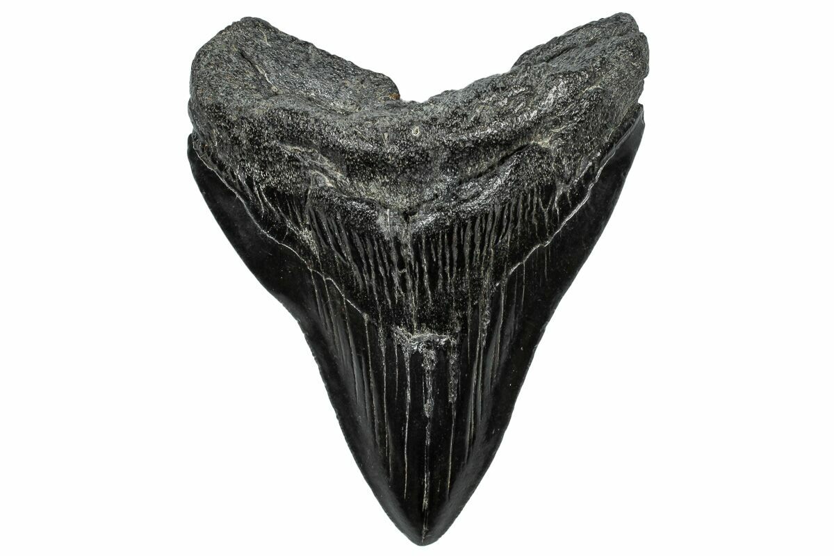 The standard measure for megalodon teeth is slant height, or the longest edge of the tooth. Adult megalodon teeth were typically in the 4 to 5 inch range: teeth over 6 inches are rare and represent super-sized individuals. Only a handful of teeth have ever been found over seven inches.