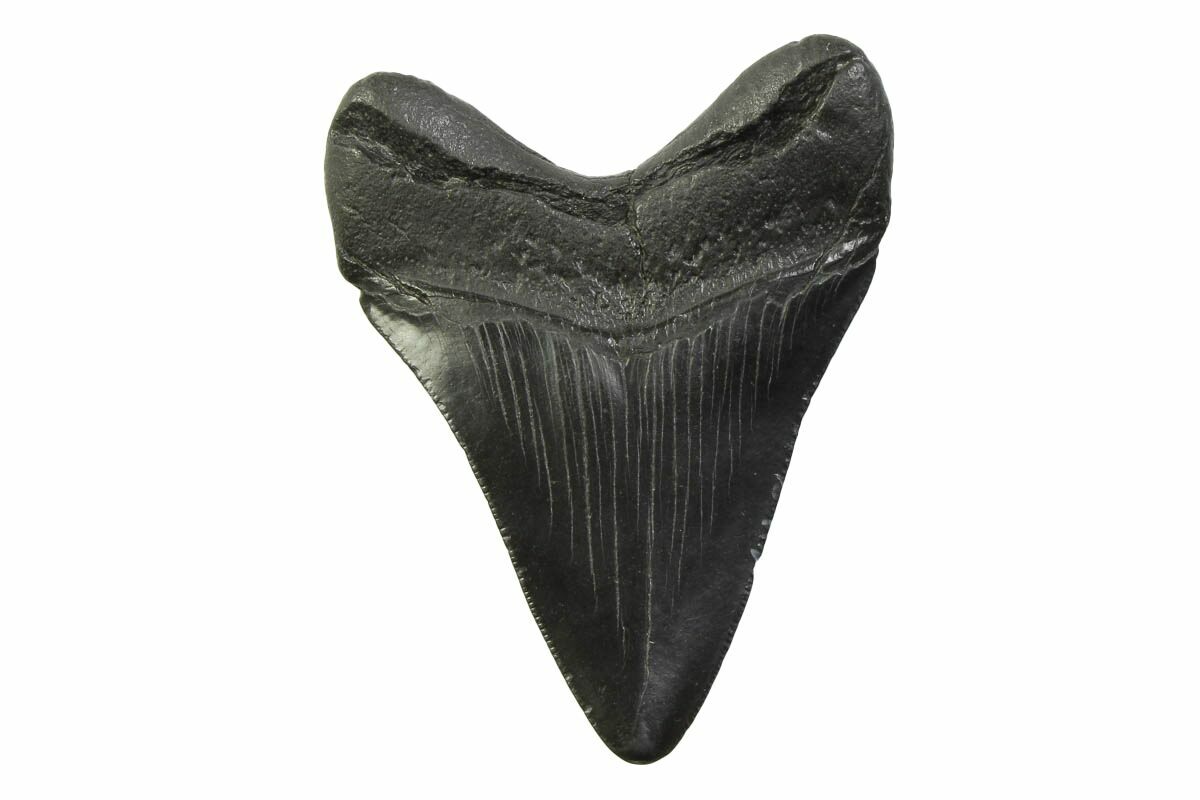 The standard measure for megalodon teeth is slant height, or the longest edge of the tooth. Adult megalodon teeth were typically in the 4 to 5 inch range: teeth over 6 inches are rare and represent super-sized individuals. Only a handful of teeth have ever been found over seven inches.