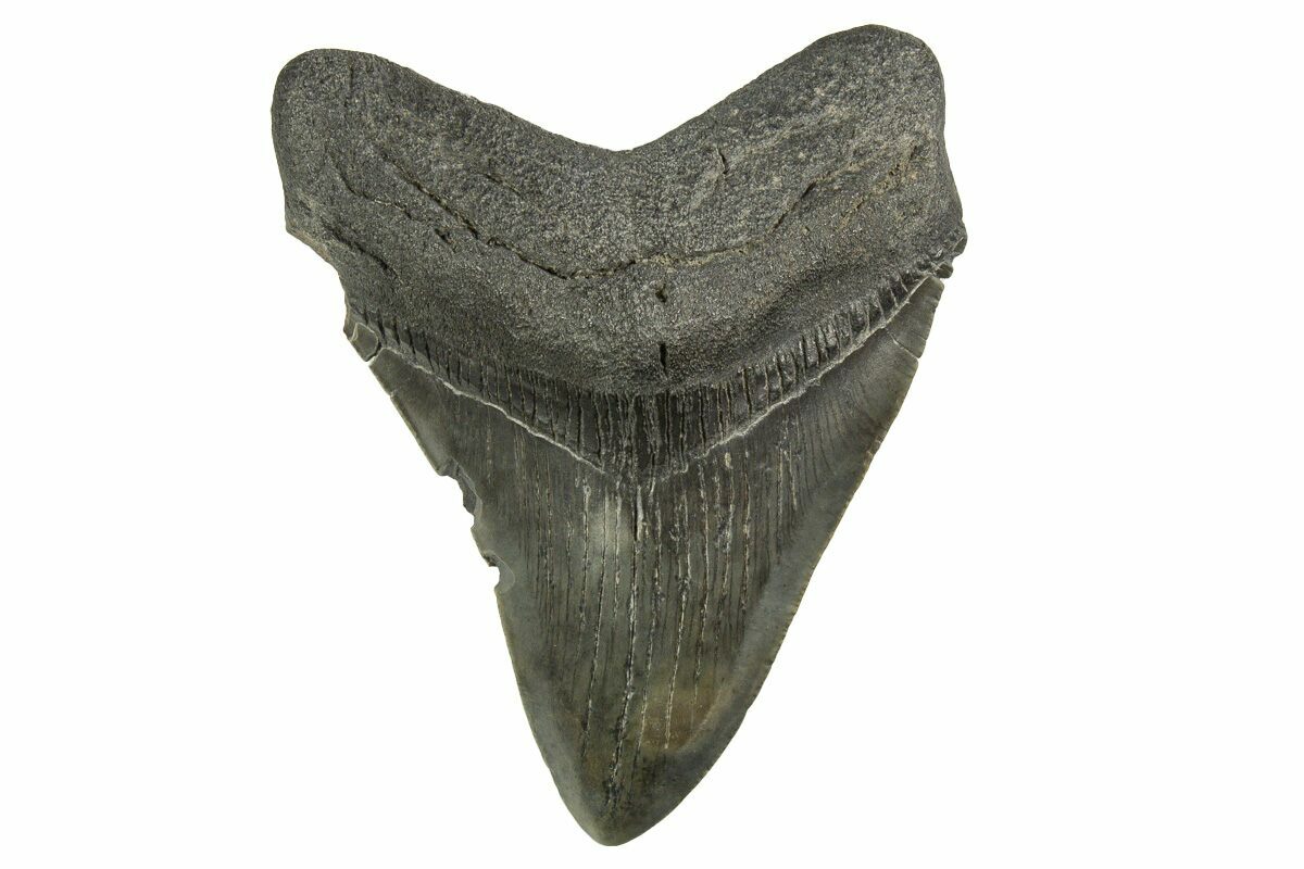 The standard measure for megalodon teeth is slant height, or the longest edge of the tooth. Adult megalodon teeth were typically in the 4 to 5 inch range: teeth over 6 inches are rare and represent super-sized individuals. Only a handful of teeth have ever been found over seven inches.