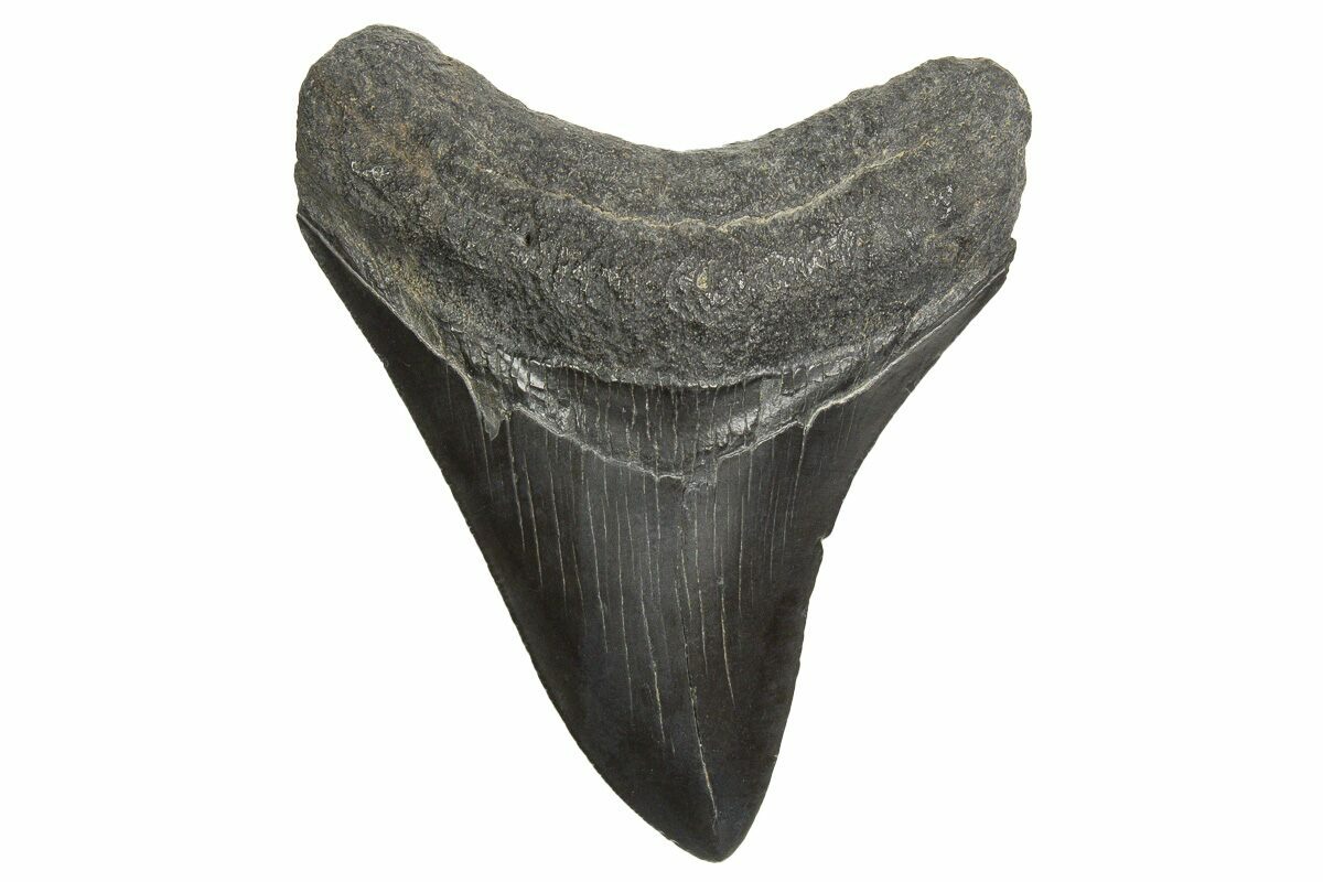 The standard measure for megalodon teeth is slant height, or the longest edge of the tooth. Adult megalodon teeth were typically in the 4 to 5 inch range: teeth over 6 inches are rare and represent super-sized individuals. Only a handful of teeth have ever been found over seven inches.