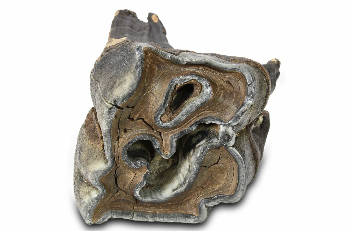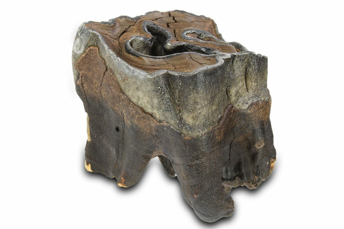 This is a well preserved fossil tooth from a woolly rhinoceros (Coelodonta antiquitatis). The enamel is very well preserved. This fossil comes from Siberia, Russia, where many woolly mammoth and woolly rhino fossils are unearthed. The tooth is mostly complete and has most of its root intact. Including the root, the tooth measures 3.85" tall.