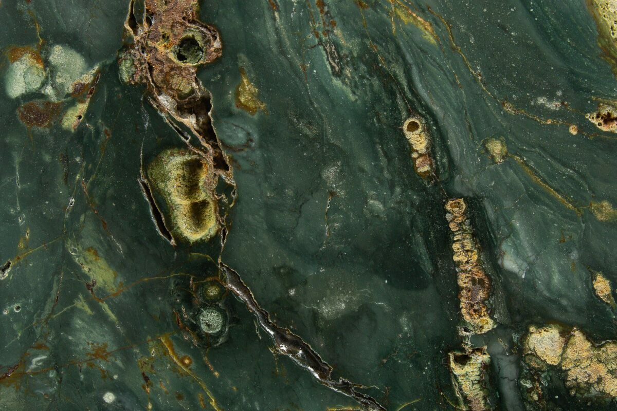 Gary Green Jasper, also referred to as petrified bog wood or Larsonite, is a form of petrified wood from a location near McDermitt, Oregon on the Nevada/Oregon border. It is believed to be wood covered by volcanic activity between 11-15 million years ago. The volcanic event covered this area in debris that deprived the plants of oxygen, halting the decay process. Minerals from the volcanic ash then acted as the replacement material for this petrification/mineralization, giving the wood these vibrant colors.