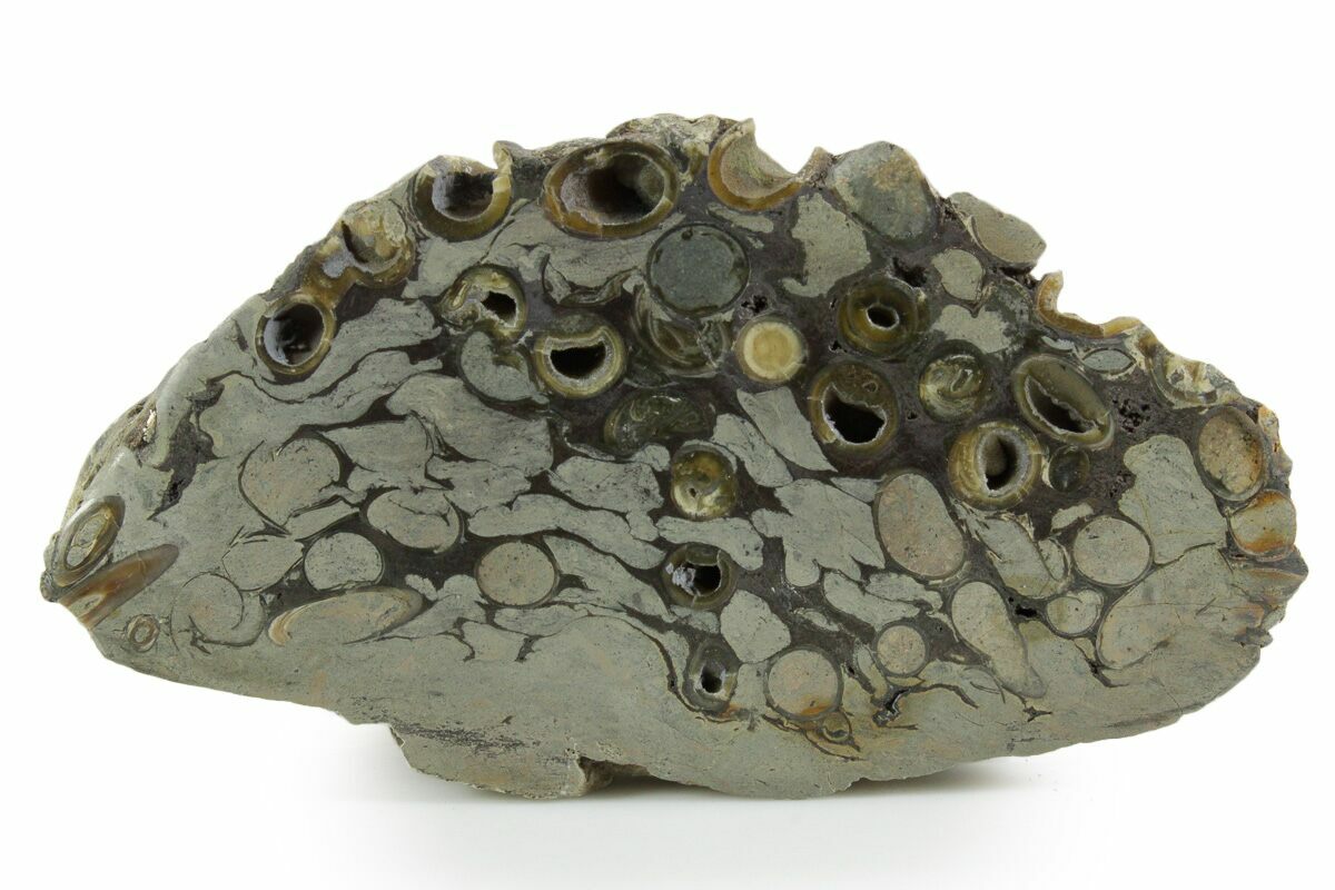 This is a polished slab of fossil Teredo Wood from the Isle of Sheppey in England. Teredo petrified wood is unique because of the "worming" of the original wood by the prehistoric Teredo (Teredolites longissimus)--a worm-shaped marine mollusk related to modern clams, mussels, and oysters. This petrified wood comes out of the London Clay Formation and is Eocene in age. The teredo burrows have been lined with calcite, giving the petrified wood a very interesting look.