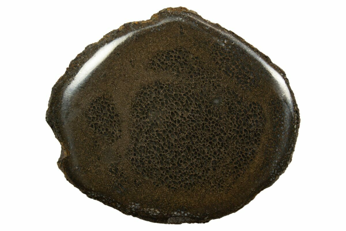 This is a 3.85" wide piece of polished bone from a pliosaur (Stretosaurus (Pliosaurus) cf. macromerus). It comes from the Middle Jurassic - Kimmeridgian Stage (154 million year old) deposit in Abingdon, England. This bone has been cut into a slab and polished on one side to reveal the beautifully preserved, agatized cell structure.