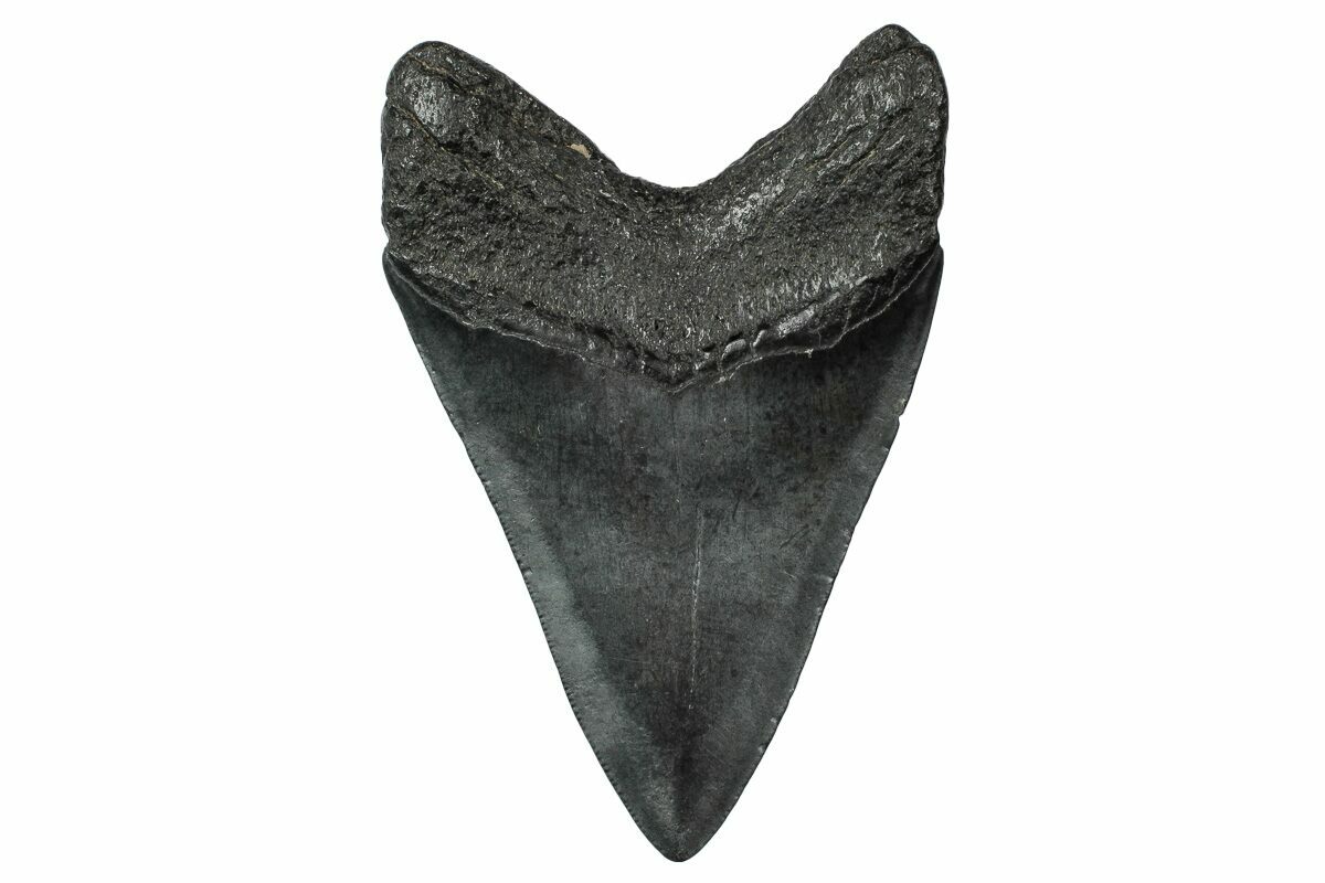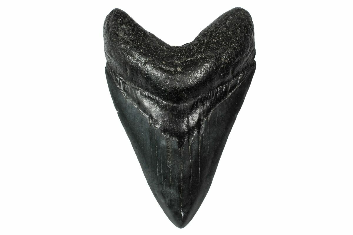 The standard measure for megalodon teeth is slant height, or the longest edge of the tooth. Adult megalodon teeth were typically in the 4 to 5 inch range: teeth over 6 inches are rare and represent super-sized individuals. Only a handful of teeth have ever been found over seven inches.