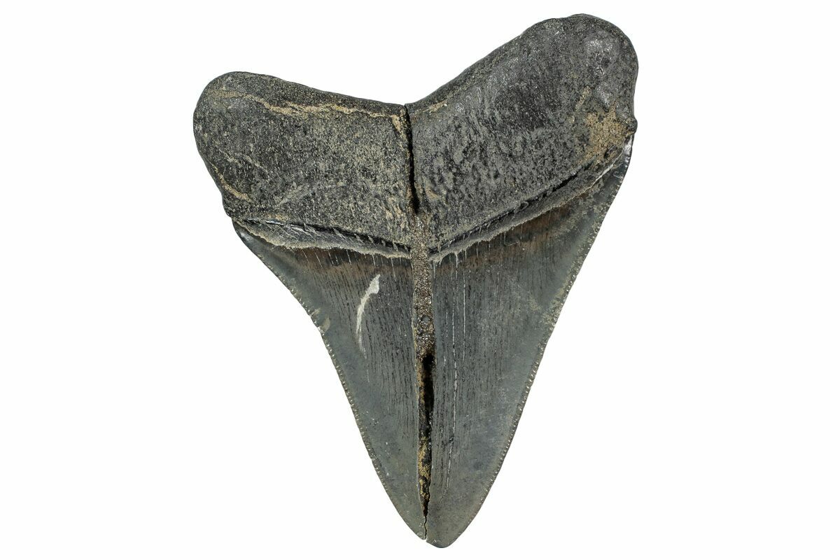 This is a 3.88" long fossil megalodon tooth collected from the Savannah River area along the border of Georgia and South Carolina. The tooth would have come from an adult, prehistoric, mega-shark in the 30+ foot size range.