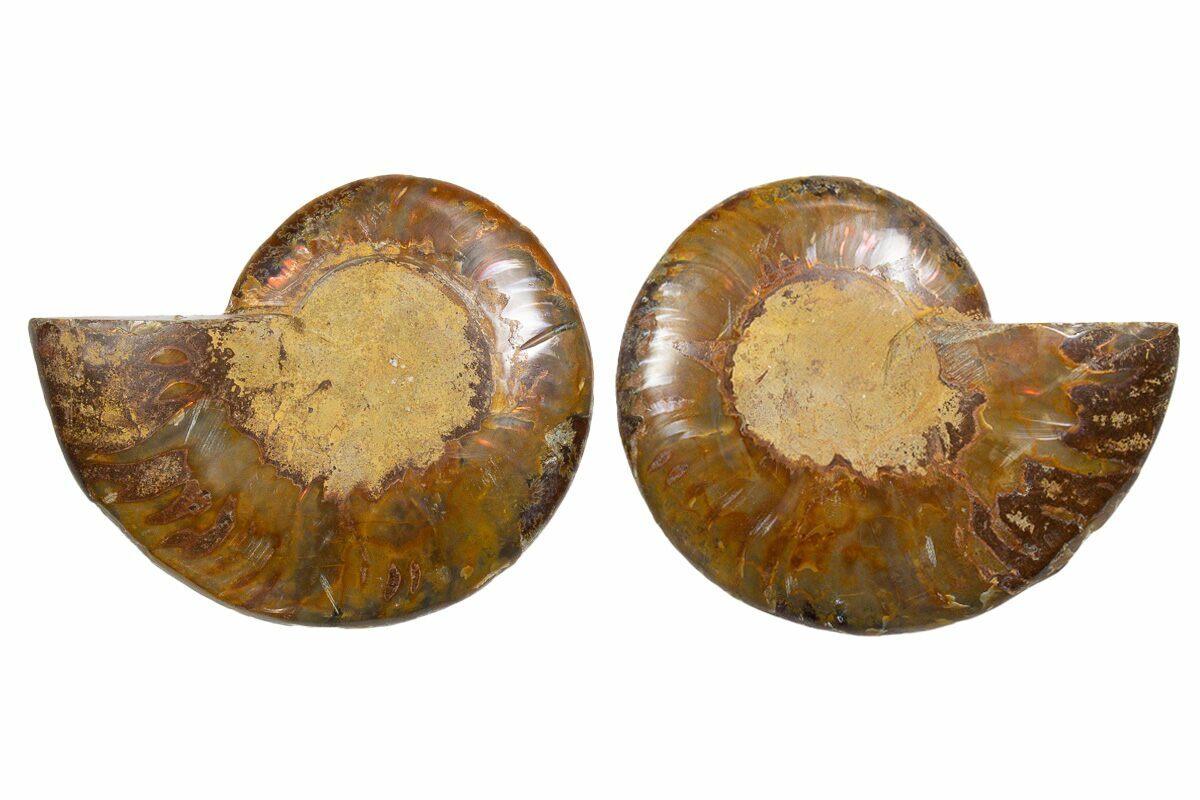 his is a beautiful 3.9" wide, cut and polished Cleoniceras ammonite from Ambatolafia, Madagascar, dating to the Albian Stage of the Late Cretaceous (~110 million years old). Its chambers reveal striking mineralization bordered by white calcite septa, creating an elegant, highly polished display piece. Both halves are included, along with display stands.