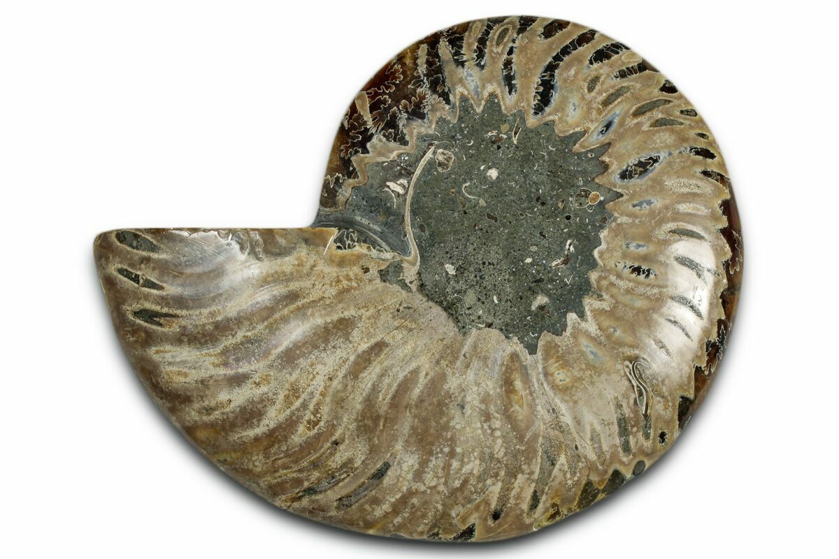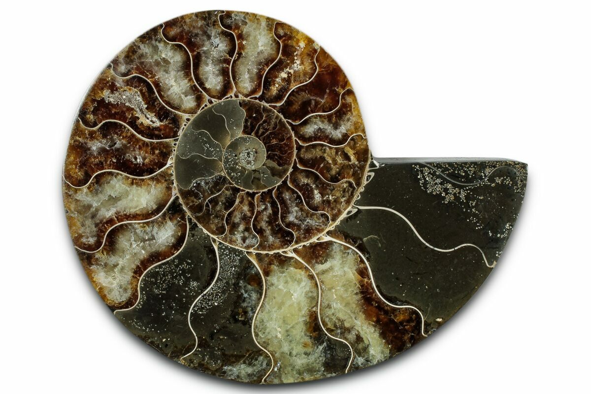 Here is a beautiful, 3.9" wide, cut and polished Cleoniceras ammonite fossil from Madagascar. These ammonites are Cretaceous in age, approximately 110 million years old. This specimen exhibits gorgeous mineralization within the chambers, each separated by white calcite septa (divisions). This highly polished, exotic ammonite makes a superb display piece with tremendous historical appeal.