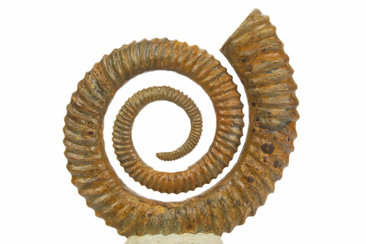 This is a large, 3.9" Early Devonian ammonoid cephalopod (Anetoceras) collected near Tazarine, Morocco. Nearly all of the limestone surrounding it has been removed during preparation, creating a very aesthetic display. The orange coloration is natural.