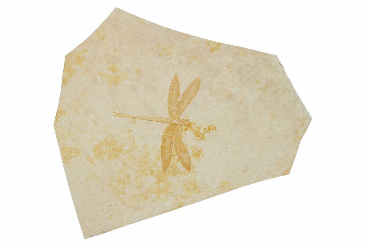 This is a 3.9" wide (wingspan) fossil dragonfly (Tharsophlebia sp.) from the Upper Jurassic Solnhofen Limestone of Germany. Complete fossil dragonflies are rare finds in this formation and there are several species present. This one is nicely detailed and presented on a 10.2 x 8.5" slab of limestone.