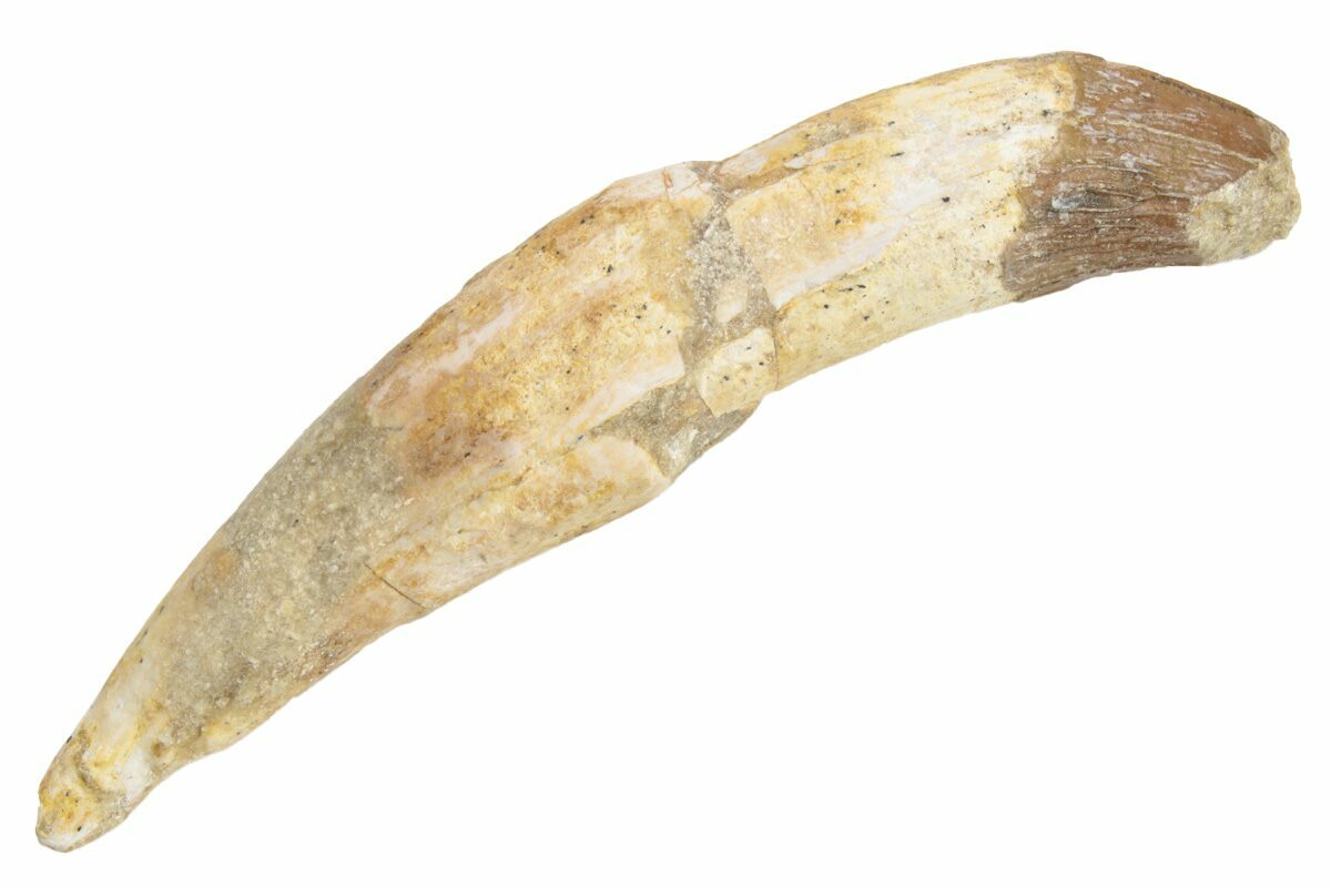 This is a 3.9" long tooth (incisor) from a Basilosaurid, a type of Archaeocete (primitive whale). These rare teeth come from the Late Eocene-aged deposits in the Western Sahara near Dakhla, Morocco. They're often found associated with teeth of the shark Auriculatus, a Megalodon ancestor. Our research indicates the most likely species is the Basilosaur, Zygorhiza kochii, but it's not definitive.