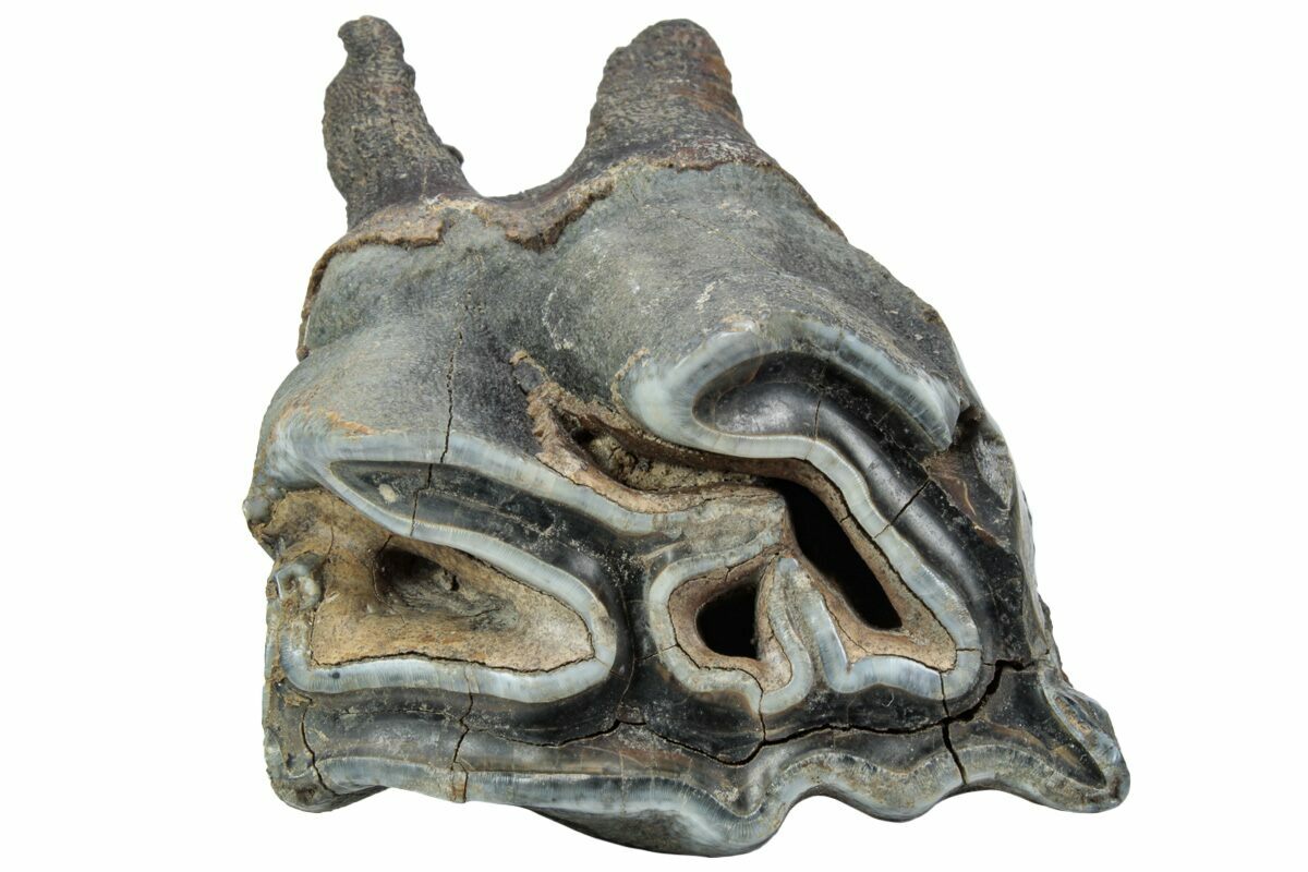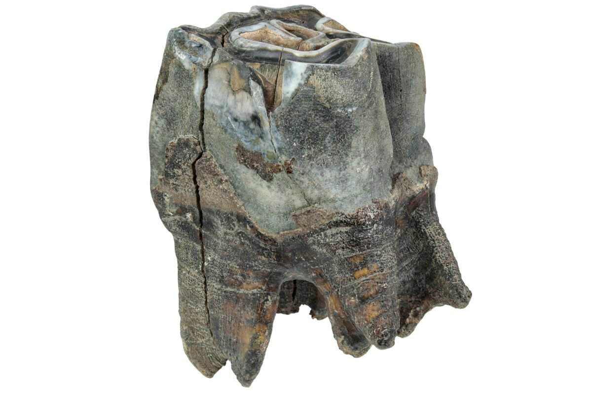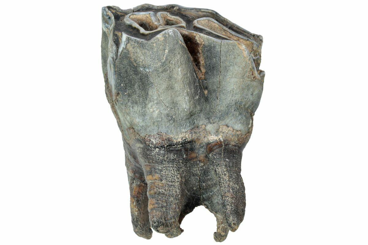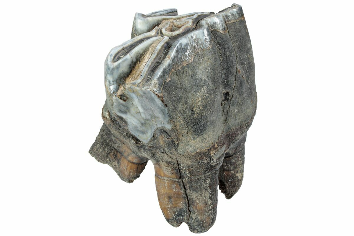 This is a well preserved fossil tooth from a woolly rhinoceros (Coelodonta antiquitatis). The enamel is very well preserved, with black-gray tones coating most of the crown. This fossil comes from Siberia, Russia, where many Woolly Mammoth and Rhino fossils are unearthed. The tooth is mostly complete and has most of its root intact. Including the root, the tooth measures 3.9" tall.