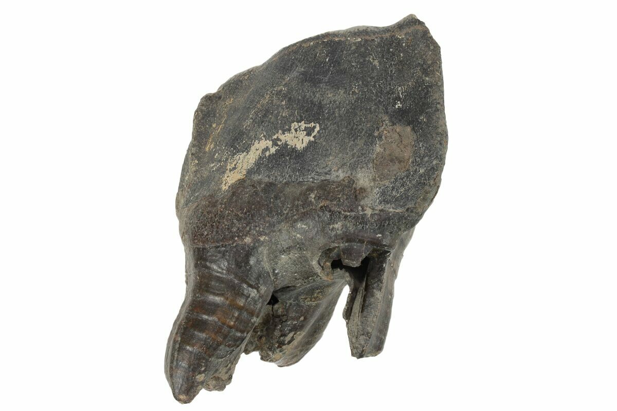 This is a well preserved fossil tooth from a woolly rhinoceros (Coelodonta antiquitatis). The enamel is very well preserved, with black-gray tones coating most of the crown. This fossil comes from Siberia, Russia, where many Woolly Mammoth and Rhino fossils are unearthed. The tooth is mostly complete and has much of its root intact. Including the root, the tooth measures 3.9" tall.