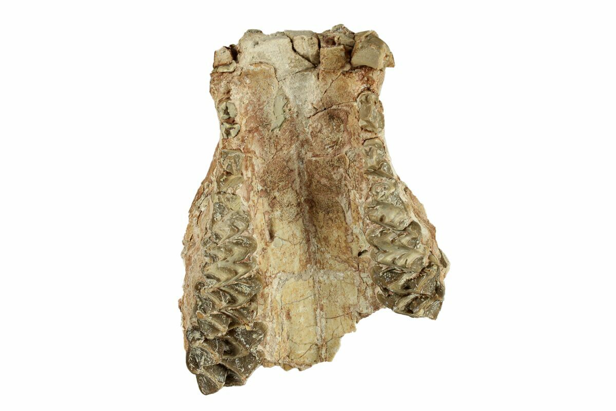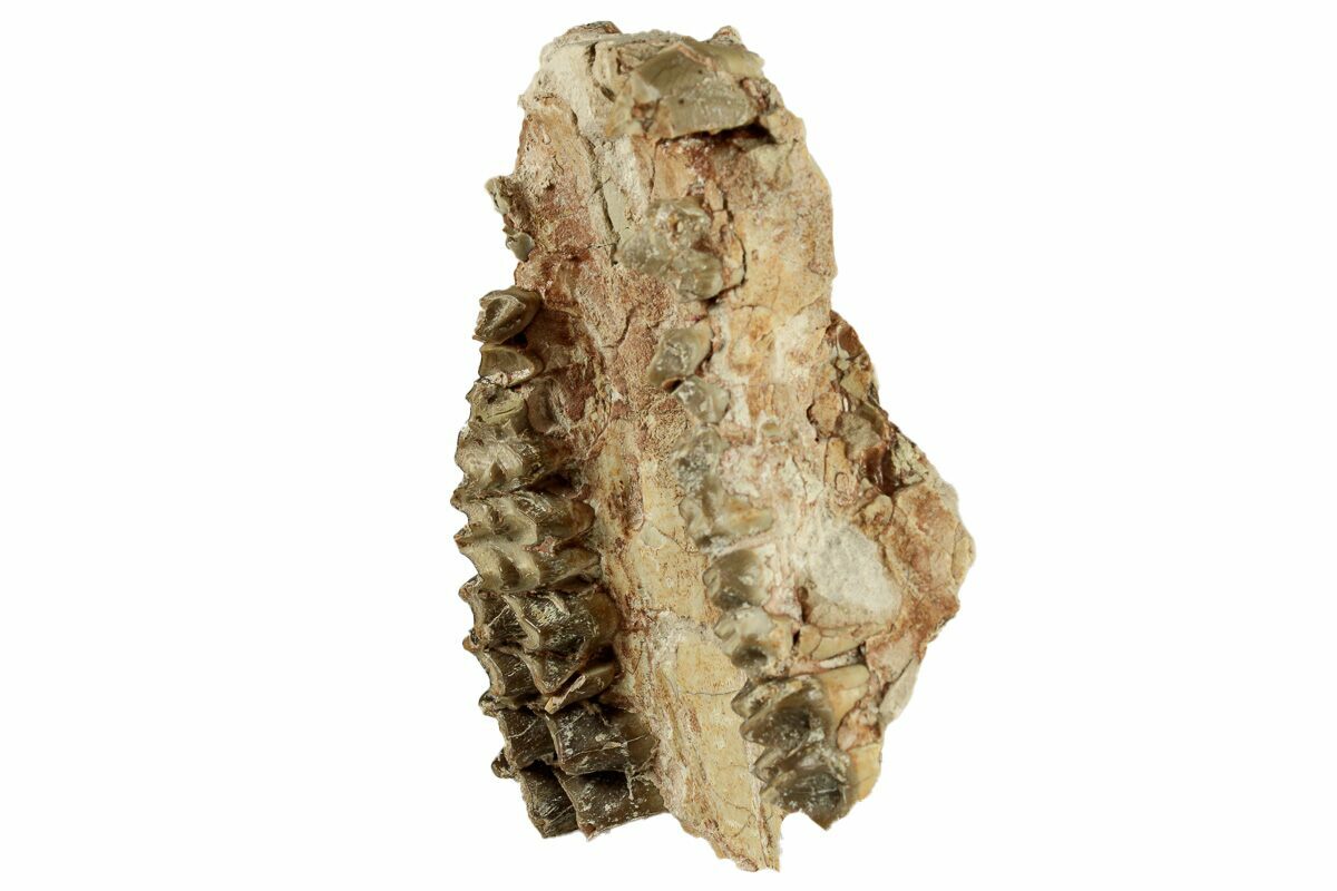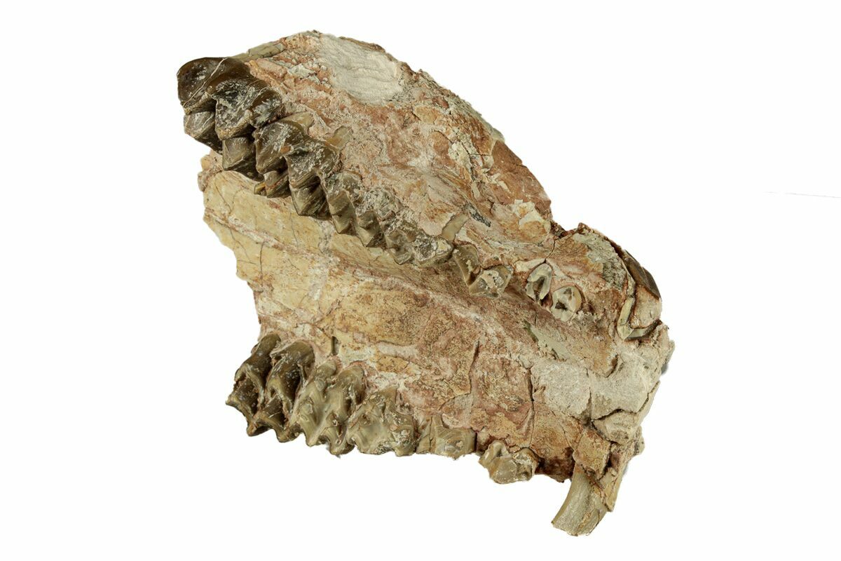This is a 3.9" long, partial upper skull of an oreodont (Merycoidodon culbertsoni). It was collected from the White River Formation in Pennington County, South Dakota and would be approximately 30-35 million years old. It contains several well preserved teeth.