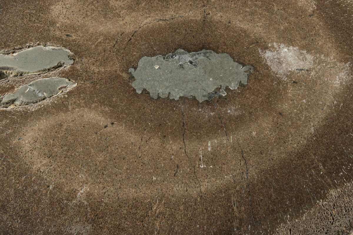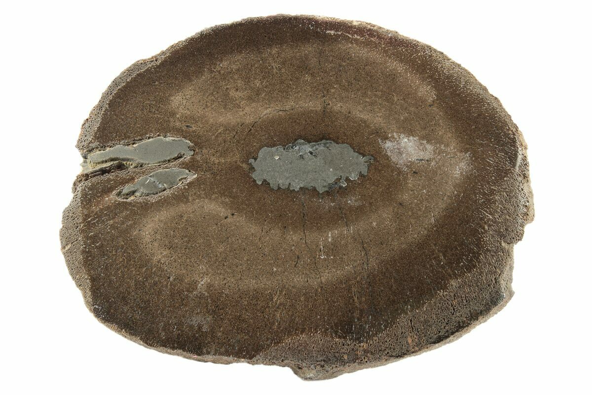 This is a 3.9" wide slice of polished limb bone from the pliosaur, Liopleurodon sp.. This genus of pliosaur has gained much notoriety and received the nickname "Predator X". The bone comes from the Middle Jurassic (160 million year old) Oxford Clay of England. Fragmentary bones are a fairly common occurrence in the clays of this formation and this one has been cut and polished on one side to reveal the beautifully preserved cell structure.