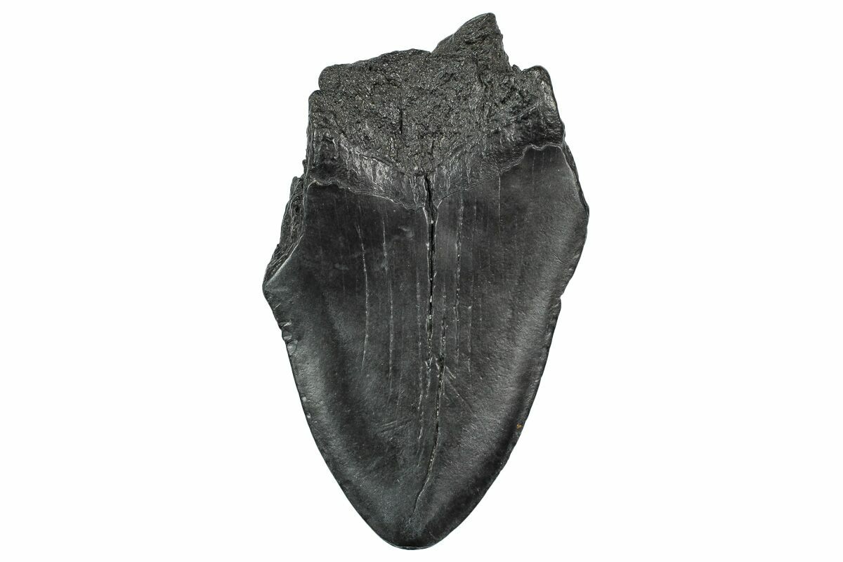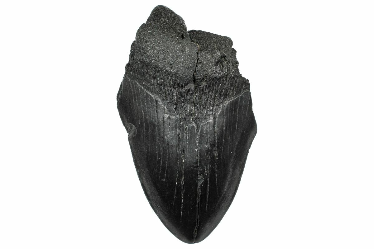The standard measure for megalodon teeth is slant height, or the longest edge of the tooth. Adult megalodon teeth were typically in the 4 to 5 inch range: teeth over 6 inches are rare and represent super-sized individuals. Only a handful of teeth have ever been found over seven inches.