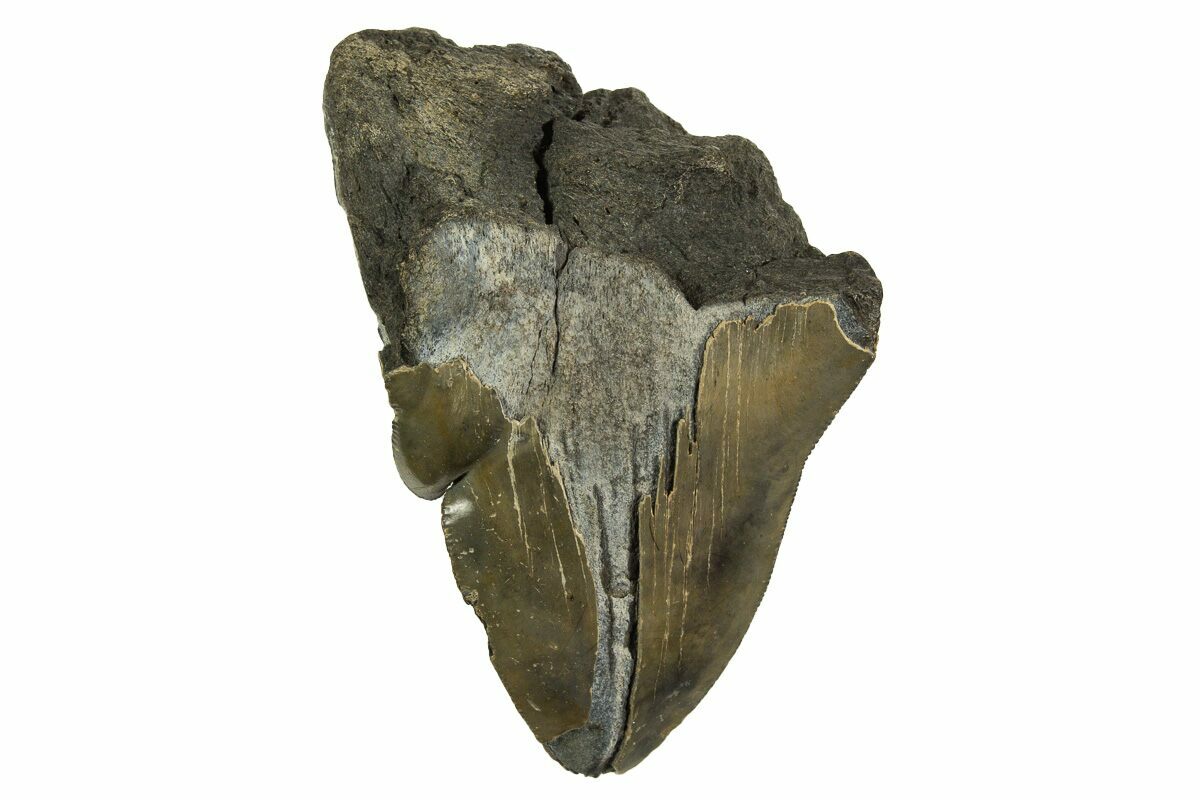 This is a fossil megalodon tooth collected from the Hawthorn Formation in Georgia. If complete, the tooth would have come from an adult, prehistoric, mega-shark in the 35+ foot size range.
