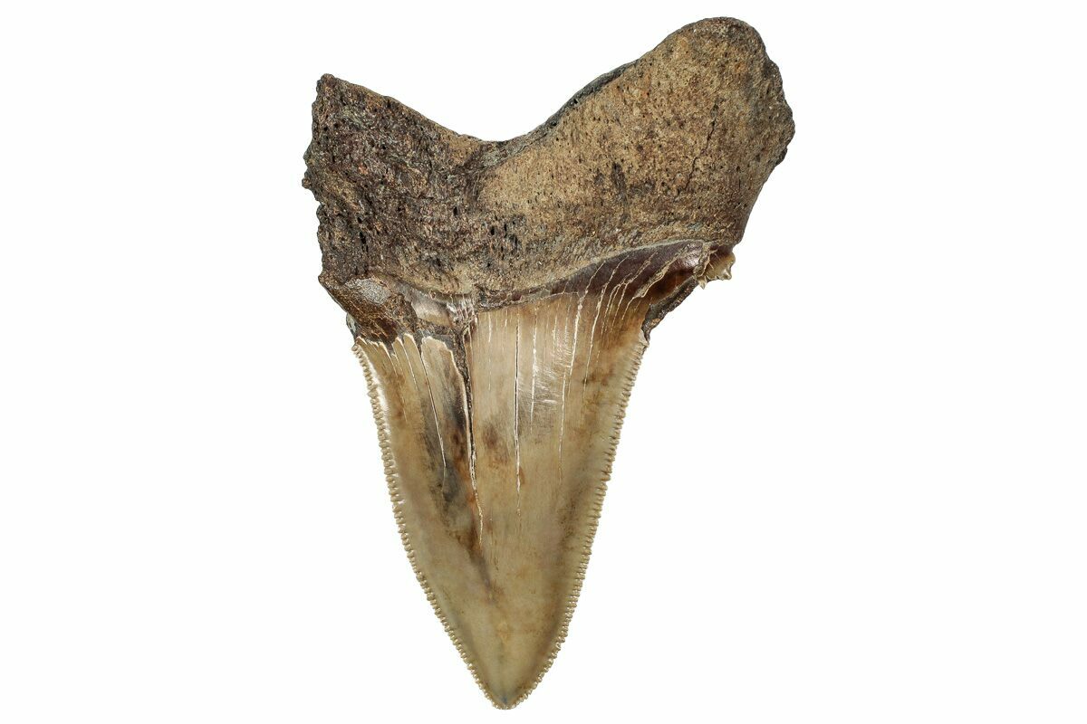This is a serrated, 3.91" long fossil Otodus angustidens shark tooth. Angustidens is believed to be an ancestor of the fearsome megalodon shark, though it did not grow nearly as large.
