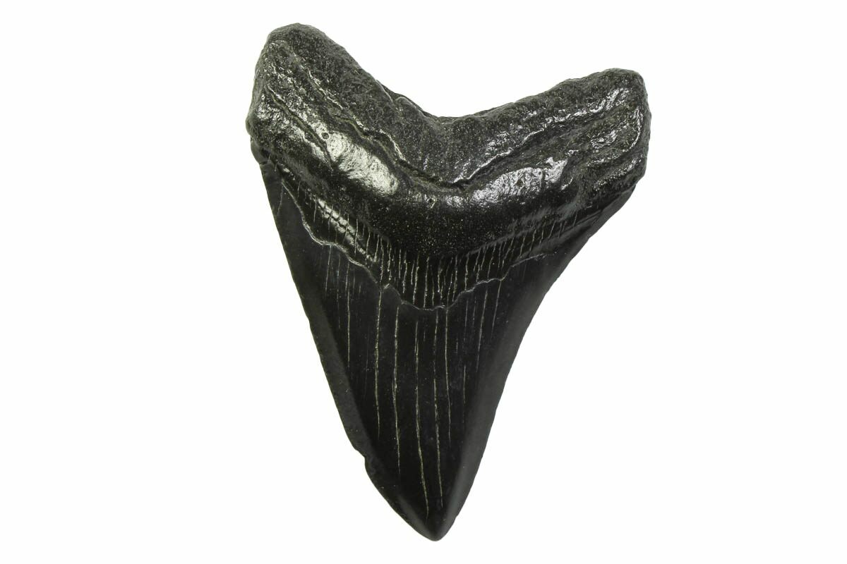 The standard measure for megalodon teeth is slant height, or the longest edge of the tooth. Adult megalodon teeth were typically in the 4 to 5 inch range: teeth over 6 inches are rare and represent super-sized individuals. Only a handful of teeth have ever been found over seven inches.