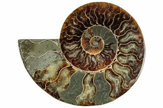 Here is an exquisite cut and polished Cleoniceras ammonite fossil from the Cretaceous of Madagascar. It exhibits gorgeous mineralization within the chambers, each separated by white calcite scepta (divisions). The reverse side has a very beautiful, mother of pearl look to it. This highly polished, exotic ammonite makes a superb display piece with tremendous historical appeal.