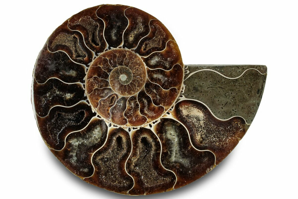 Here is a beautiful, 3.95" wide, cut and polished Cleoniceras ammonite fossil from Madagascar. These ammonites are Cretaceous in age, approximately 110 million years old. This specimen exhibits gorgeous mineralization within the chambers, each separated by white calcite septa (divisions). This highly polished, exotic ammonite makes a superb display piece with tremendous historical appeal.