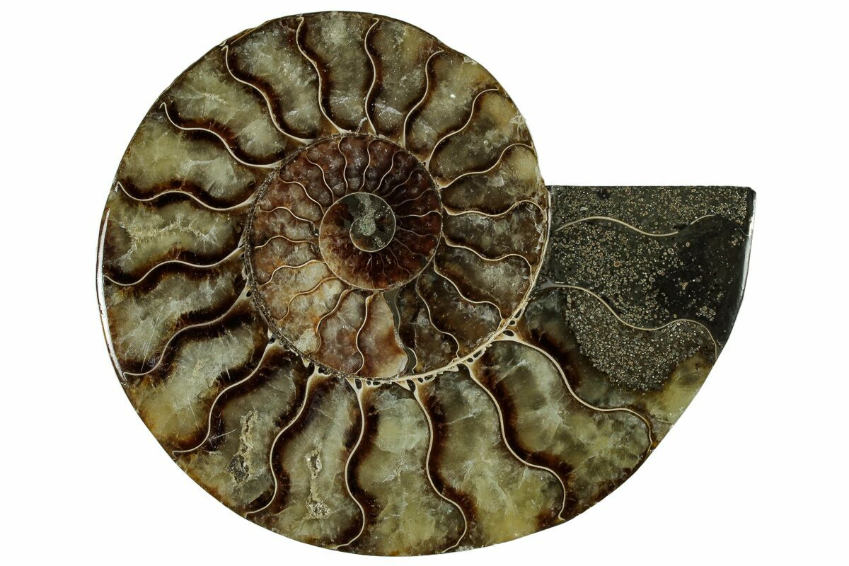 Here is a beautiful, 3.95" wide, cut and polished Cleoniceras ammonite fossil from Madagascar. These ammonites are Cretaceous in age, approximately 110 million years old. This specimen exhibits gorgeous mineralization within the chambers, each separated by white calcite septa (divisions). This highly polished, exotic ammonite makes a superb display piece with tremendous historical appeal.
