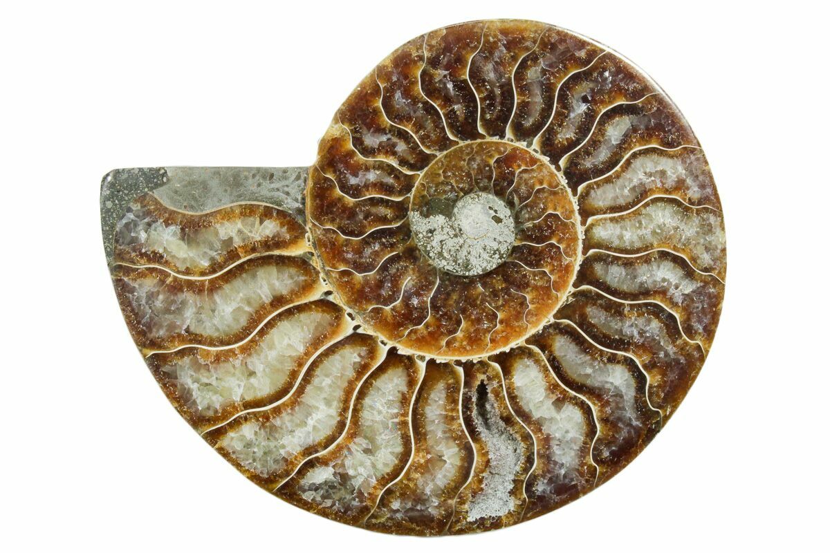 Here is a beautiful, 3.95" wide, cut and polished Cleoniceras ammonite fossil from Madagascar. These ammonites are Cretaceous in age, approximately 110 million years old. This specimen exhibits gorgeous mineralization within the chambers, each separated by white calcite septa (divisions). This highly polished, exotic ammonite makes a superb display piece with tremendous historical appeal.