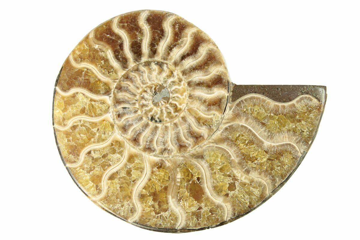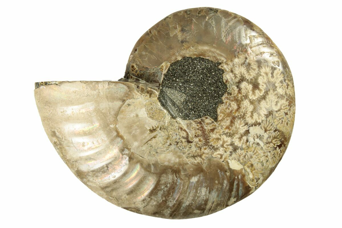 This specimen exhibits gorgeous mineralization within the chambers, each separated by white calcite septa (divisions). The outer shell also displays some iridescence. This highly polished, exotic ammonite makes a superb display piece with tremendous historical appeal.