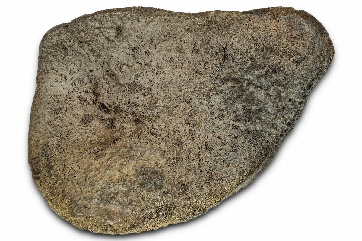This is a 3.95" wide phalanx (toe) bone from the famous duck-billed dinosaur, Edmontosaurus annectens, collected from the Hell Creek Formation in Dawson County, Montana. There are a couple repaired cracks through the bone and spots of restoration along the edges.