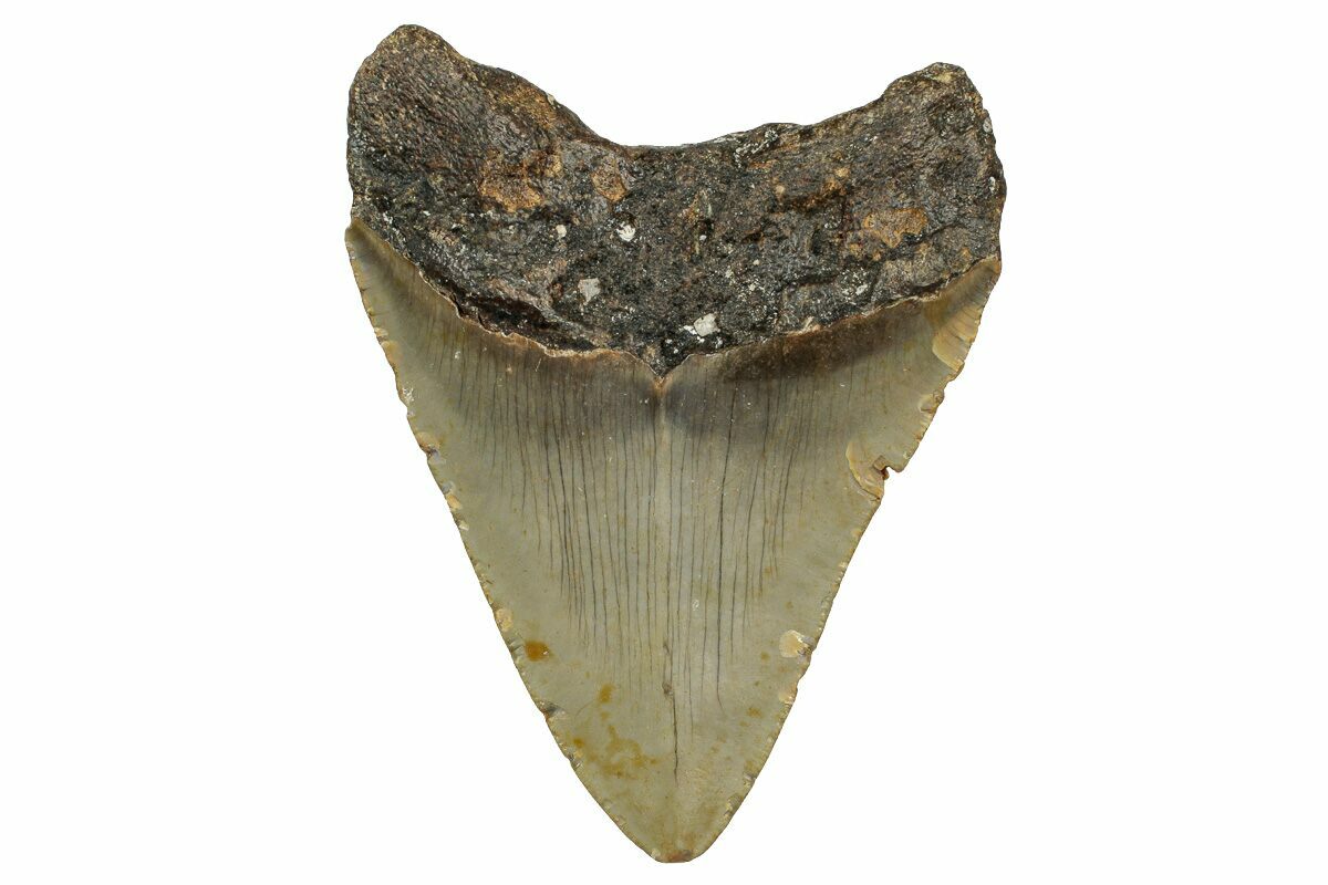 This is a 3.95" long megalodon tooth collected on the North Carolina coast. It was found by commercial divers collecting "the ledges" in about 100 feet of water. The tooth would have eroded out of the Pungo River Formation when sea levels were lower and the area where these teeth are found was at the shoreline. The fossil tooth itself would be from between 13.8 to 16 million years old. A tooth of this size would have come from a prehistoric, mega-shark in the 30 foot size range.