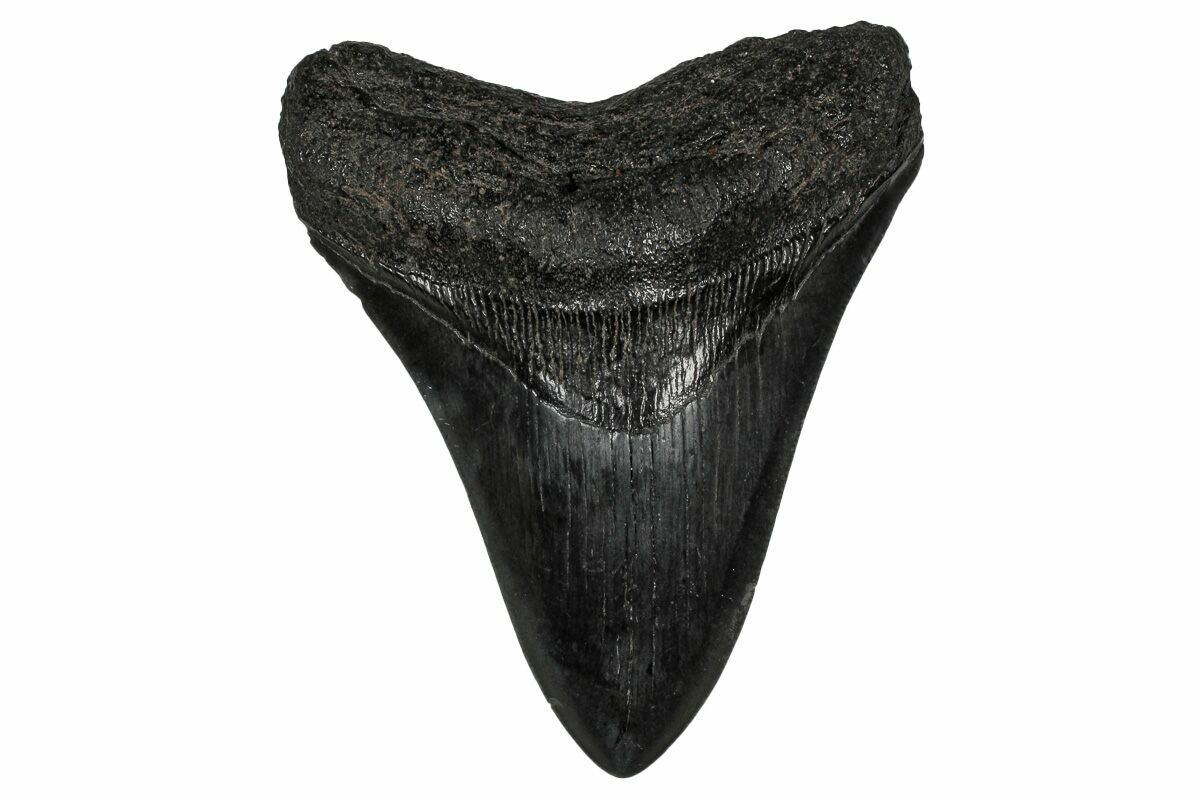 The standard measure for megalodon teeth is slant height, or the longest edge of the tooth. Adult megalodon teeth were typically in the 4 to 5 inch range: teeth over 6 inches are rare and represent super-sized individuals. Only a handful of teeth have ever been found over seven inches.