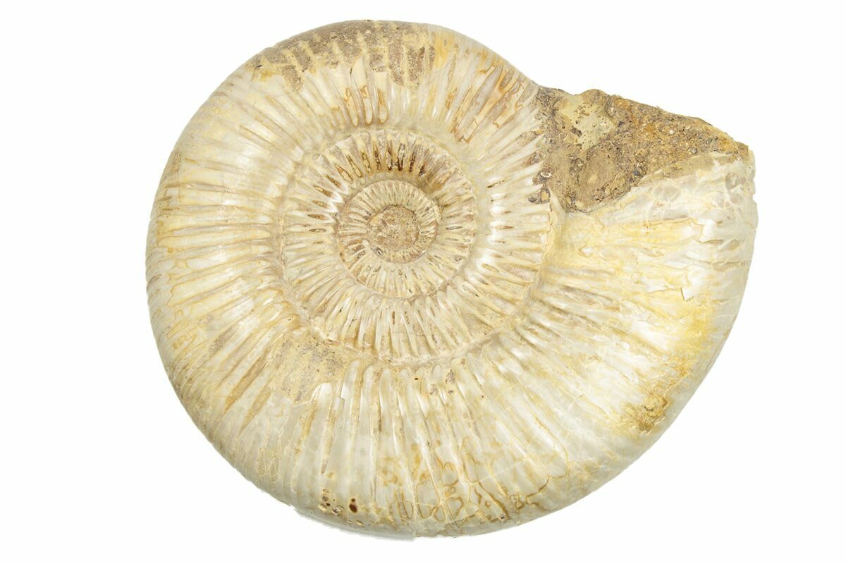 This is a 3.95" wide ammonite (Perisphinctes sp.) fossil that was collected near Sakaraha in the Tulear Province of Madagascar. It is Jurassic (Oxfordian Stage) in age or approximately 160 million years old. It has a well defined ribbing and it's quite heavy for its size. The exterior has been lightly polished.