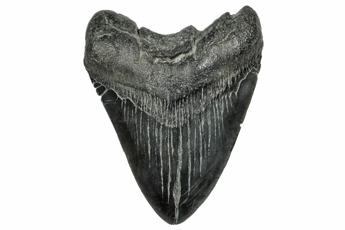 The standard measure for megalodon teeth is slant height, or the longest edge of the tooth. Adult megalodon teeth were typically in the 4 to 5 inch range: teeth over 6 inches are rare and represent super-sized individuals. Only a handful of teeth have ever been found over seven inches.
