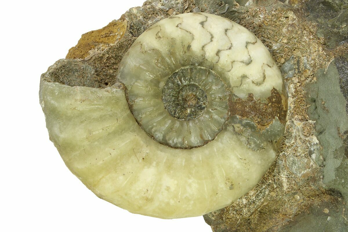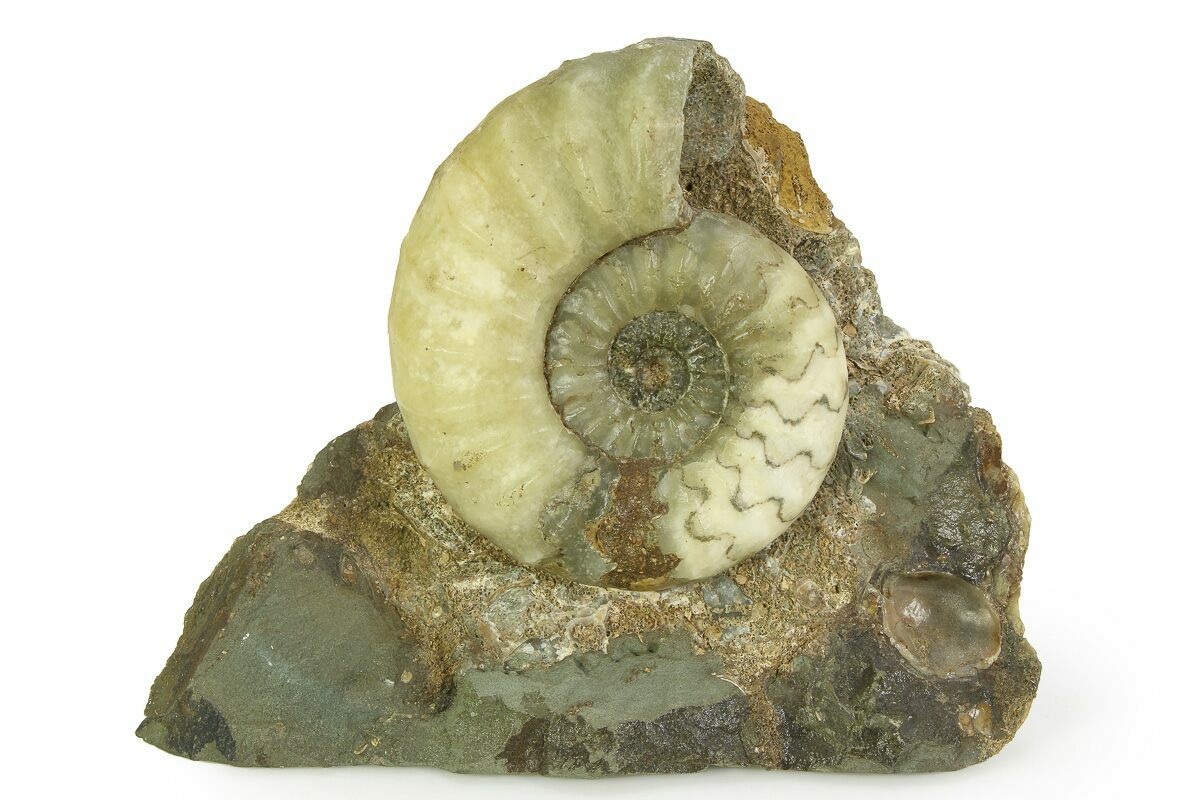 This is an absolutely beautiful ammonite fossil from the Conesby Quarry near Scunthorpe in North Lincolnshire, England. It's Lower Jurassic in age, or approximately 200 million years old. The ammonite is of the species Aegasteroceras sagittarium and measures 3" wide. The fossil was naturally replaced by calcite which contrasts nicely with the fossilized septae. The base of the rock has been cut flat for aesthetic presentation of the ammonite without the need for a display stand.