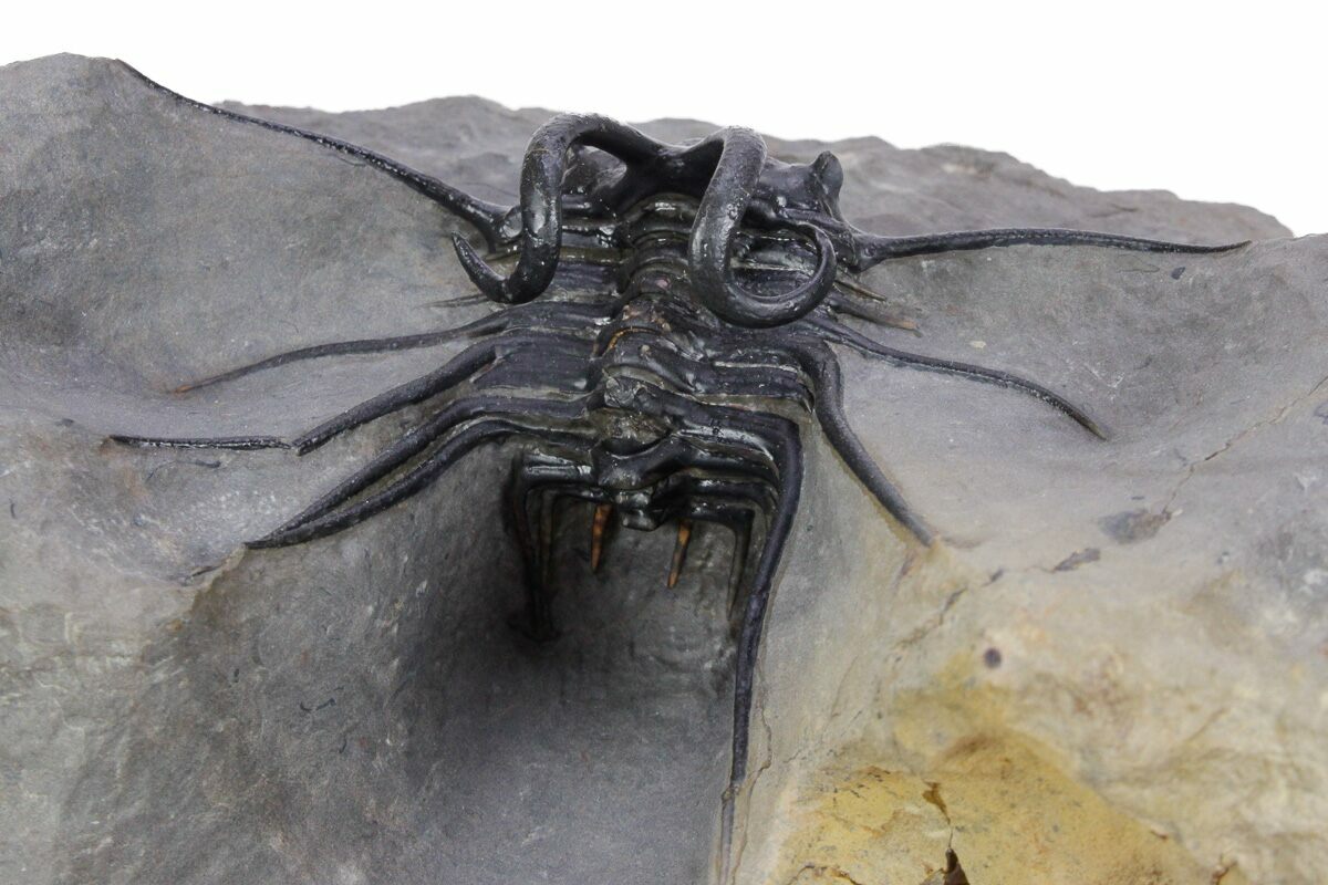 This is 3" wide specimen of Dicranurus monstrosus, one of the most striking and sought-after trilobites from the Devonian of Morocco. With its wild array of long, curling spines and devilish head horns, this “monster” of the ancient sea looks more like a creature from myth than from our planet’s deep past. Every spine and segment has been meticulously prepared from the limestone matrix, revealing the full, dramatic exoskeleton of this armored arthropod in incredible three-dimensional detail. The tail is tucked but it is complete with only about 1% restoration.