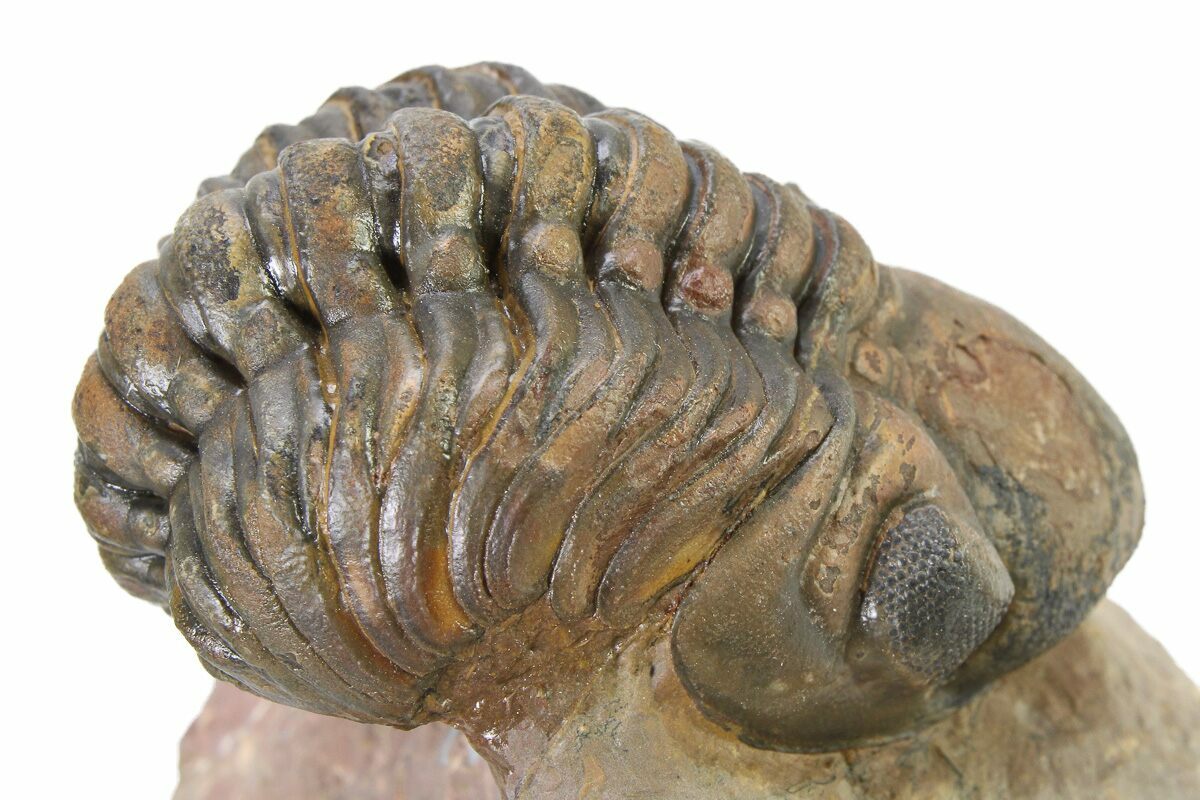 This is a 3" long, detailed Reedops trilobite collected near Atchana, Morocco. It has a lot of surface detail including visible preserved eye facets in its eyes. It has been prepared to remove the surrounding limestone so that it looks like it's ready to crawl off the rock.