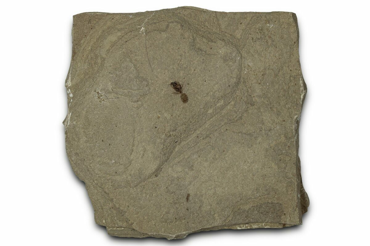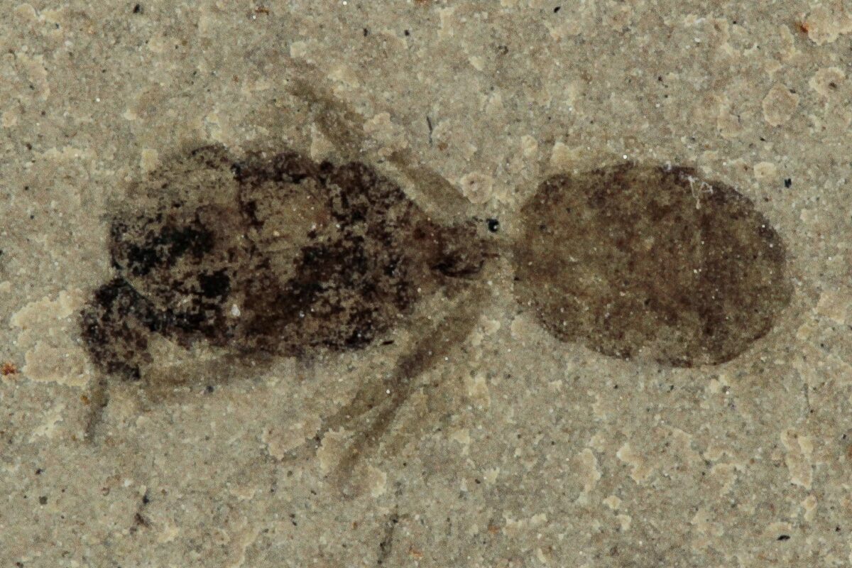 This is a detailed, .3" long fossil ant (family Formicidae) from the Green River Formation of Utah. While this formation is best known for well preserved fossil fish found in Wyoming, other sections of the formation contain a very diverse insect fauna.
