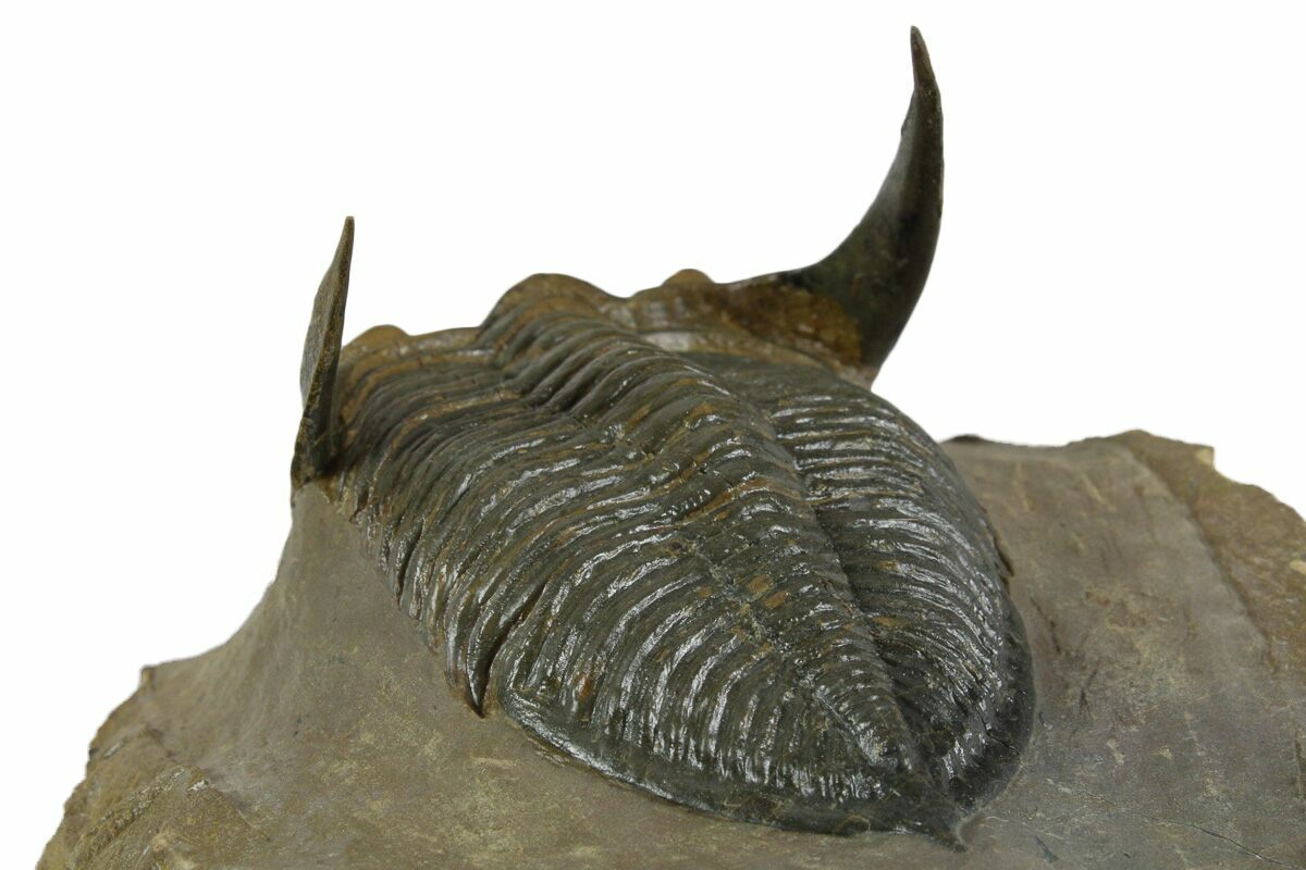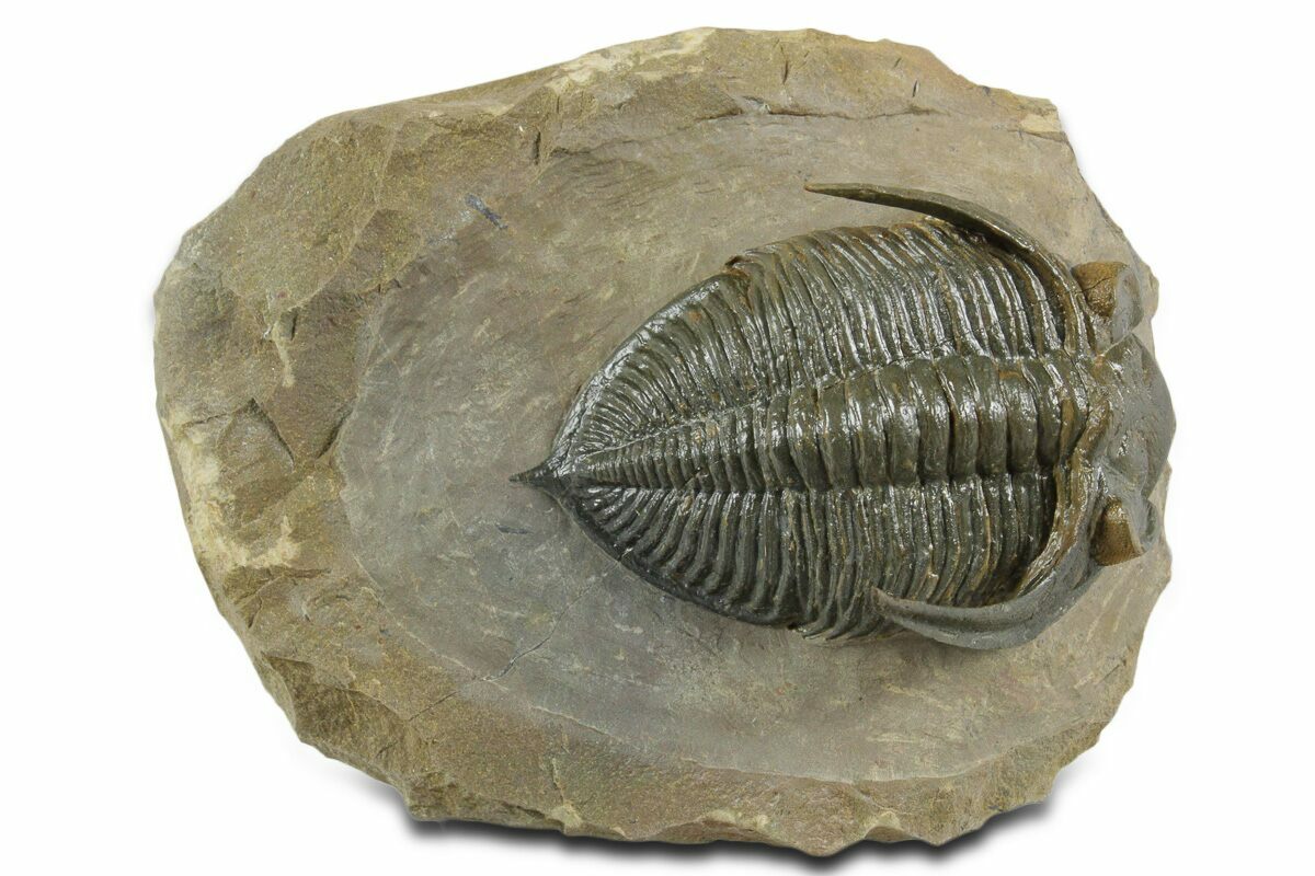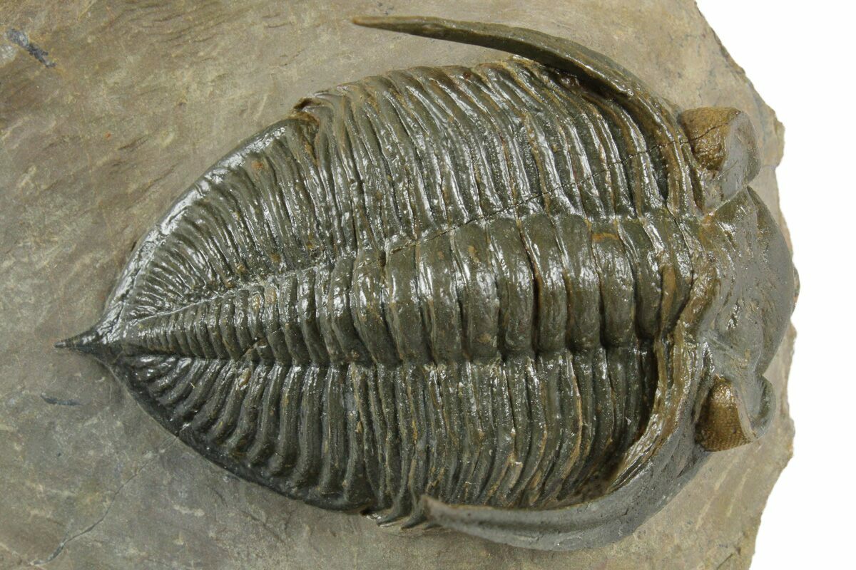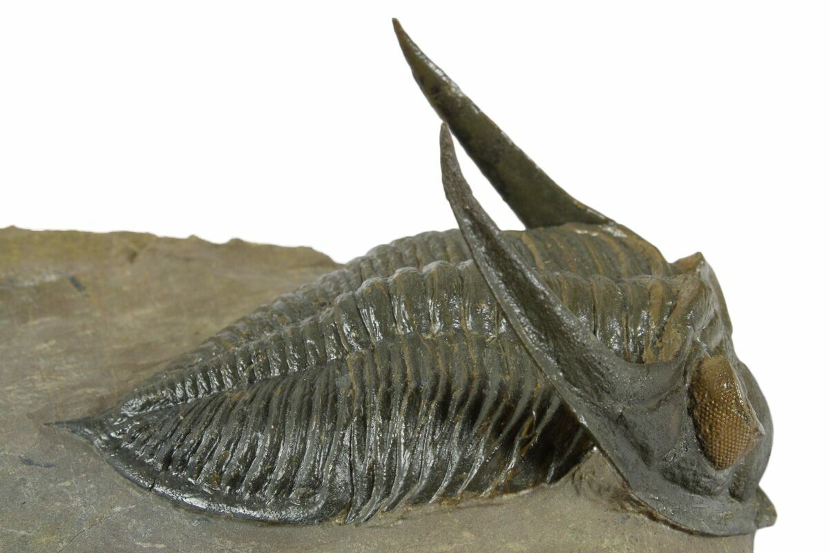 This is a spectacular, 3" long prone trilobite (Zlichovaspis rugosa) collected from the Lhandar Formation near Atchana, Morocco. \It has orange eye facet preservation a feature sometimes seen on trilobites from this locality. The head is tucked with the genal spines prepared free-standing and the trilobite fossil has no restoration.