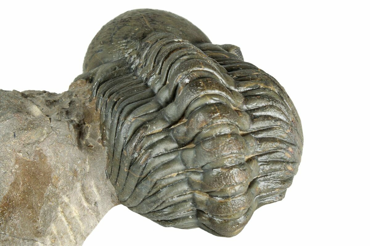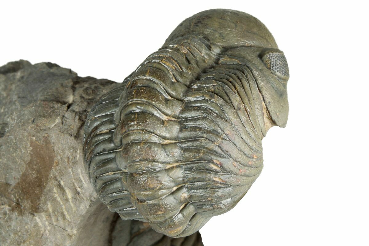 This is a stunning association of a beautiful, 3" long Crotalocephalina gibbus trilobite with a similarly sized Reedops. The piece has been prepared by removing all of the hard limestone surrounding it, leaving flying on a pedestal of rock. A really impressive display piece with only about 2% shell restoration in total.