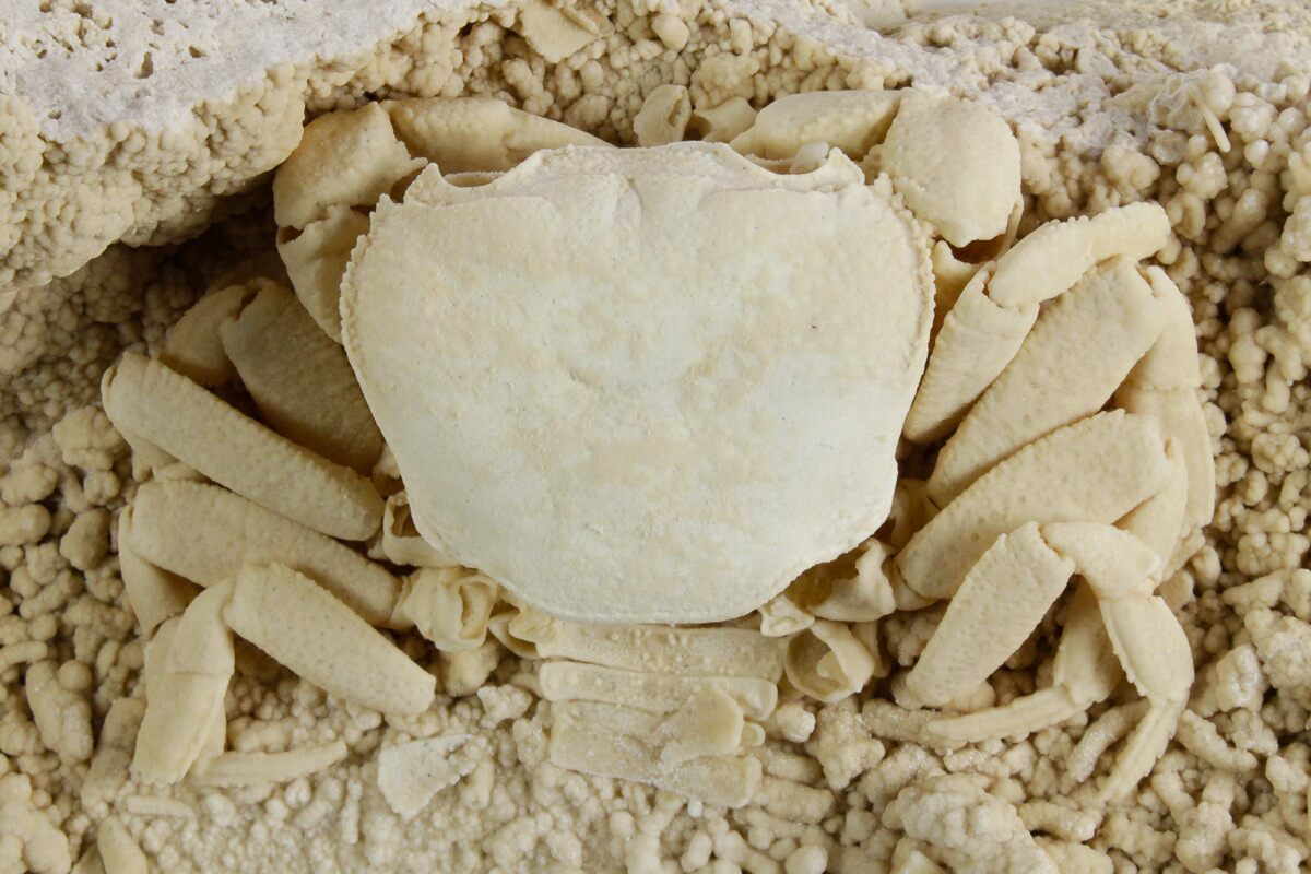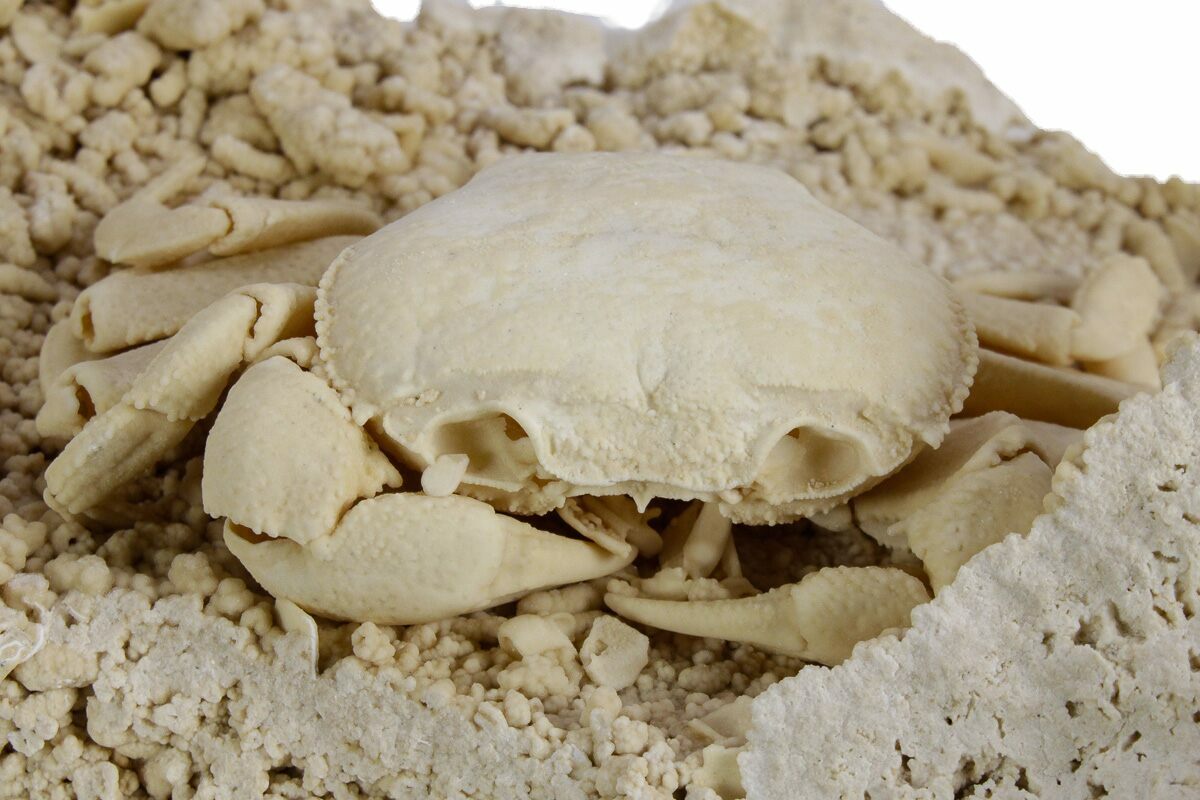 Travertine is a type of limestone that forms around mineral springs. It is often quarried for use as a building material, and that is how these crabs were discovered. They are found when hollow voids are cut into while sawing blocks of travertine. The travertine deposits in the Denizli Basin are Pleistocene in age, having been formed within the past 400,000 years.