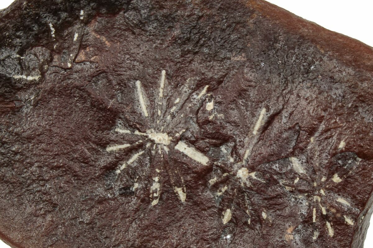 Leaves on Calamites trees formed in clusters of 8 or more, called whorls, at spaced nodes along stems. Annularia indicate flat, starburst-shaped whorls, but the shapes of the leaves themselves could vary from oval (A. sphenophylloides) to lanceolate or needle-like (A. radiata). They can also be identified by midline veins throughout the leaf from node to leaf tip.